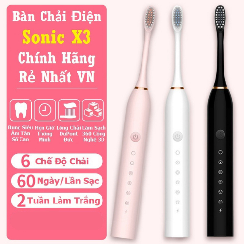 Bàn Chải Điện Sonic X3 BẢN EU Mẫu Mới 6 Chế Độ Chải Thông Minh Kèm 4 Đầu Chải Lông DuPont Cao Cấp