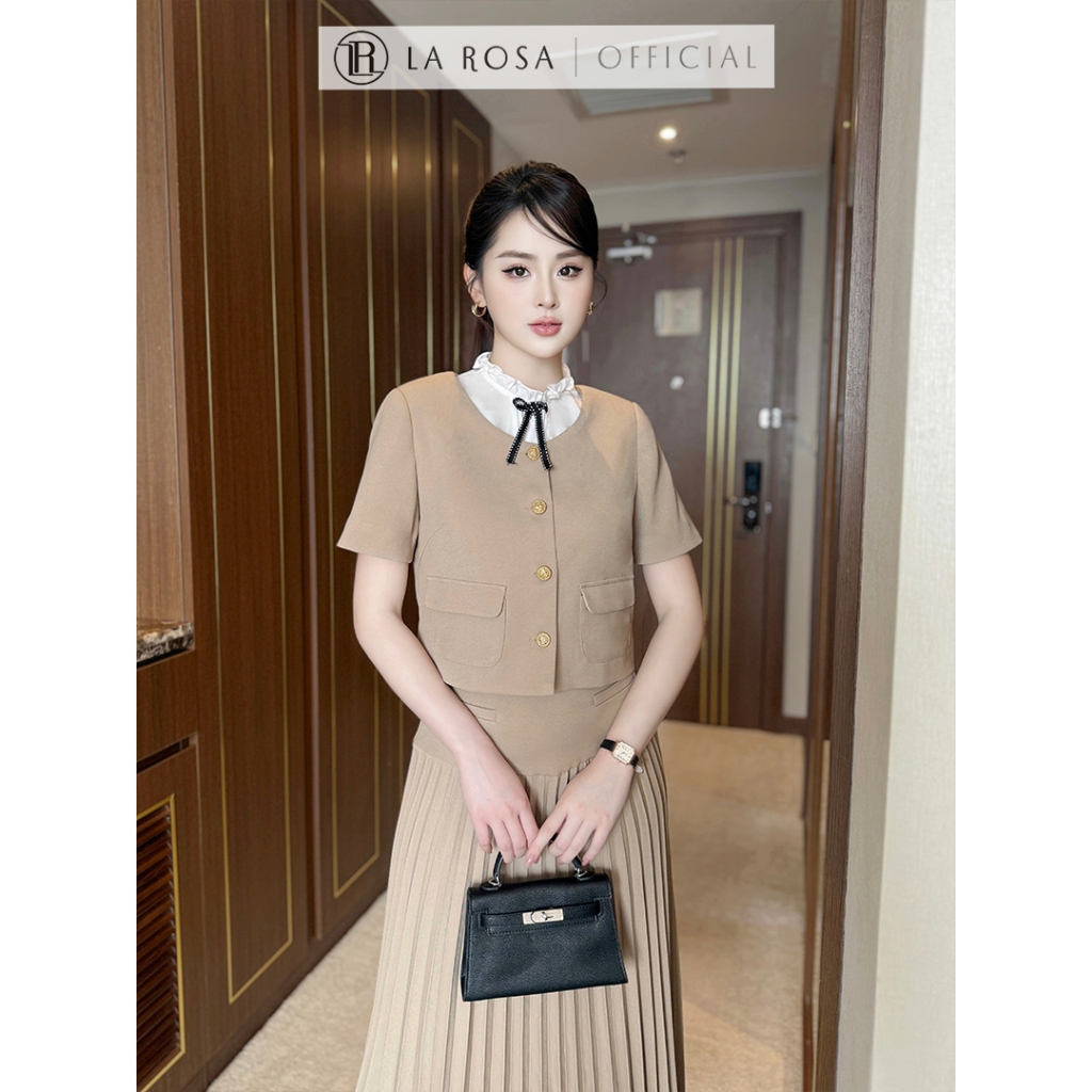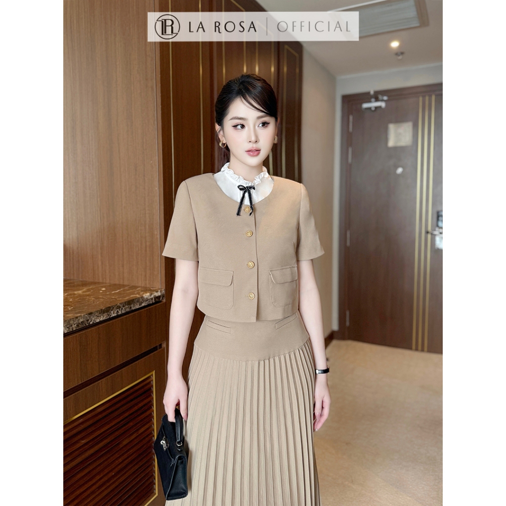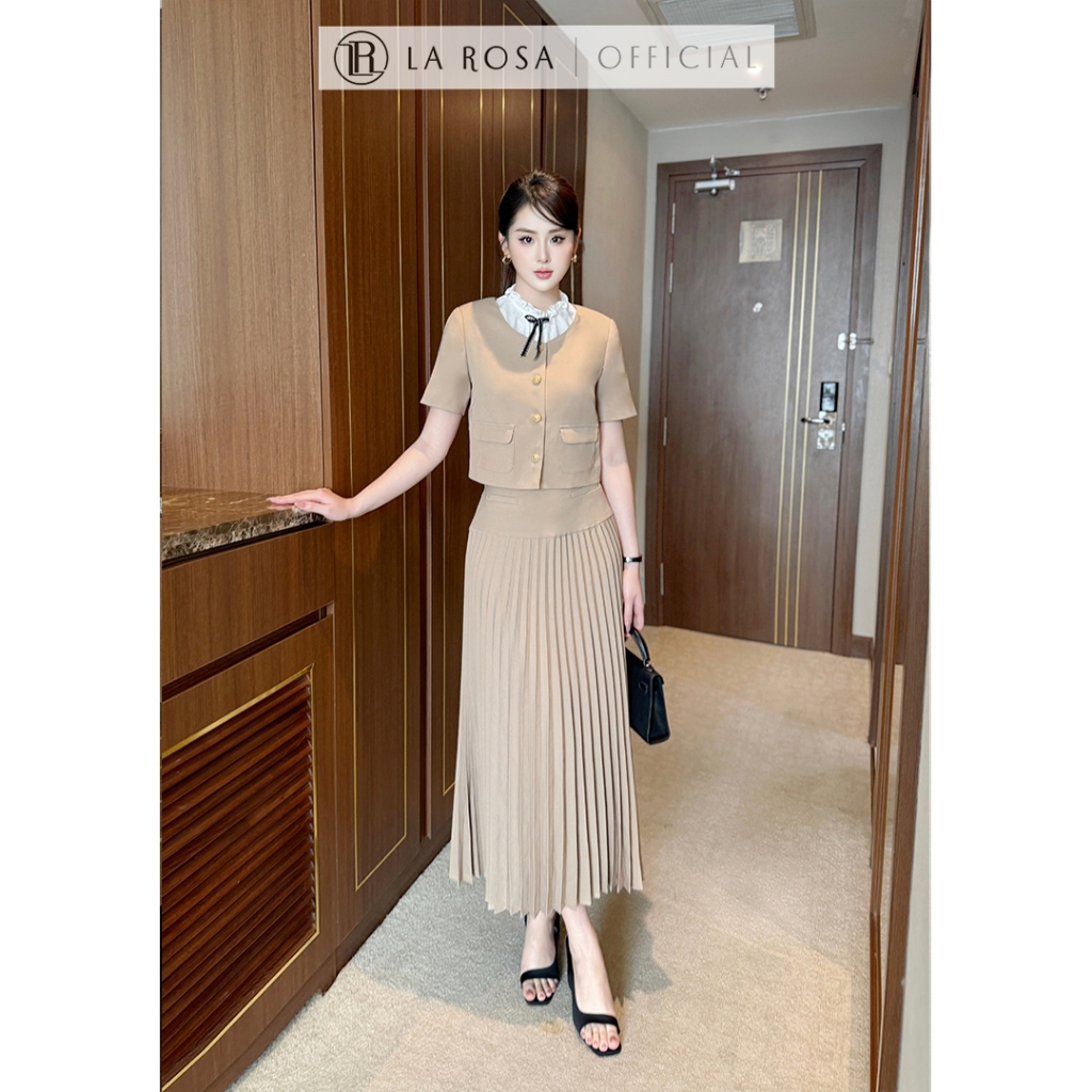 Set Váy Công Sở Nữ Thời Trang Cao Cấp La Rosa Chân Váy Xếp Ly Dài Phối Áo Croptop Tay Ngắn Cổ Nơ S863