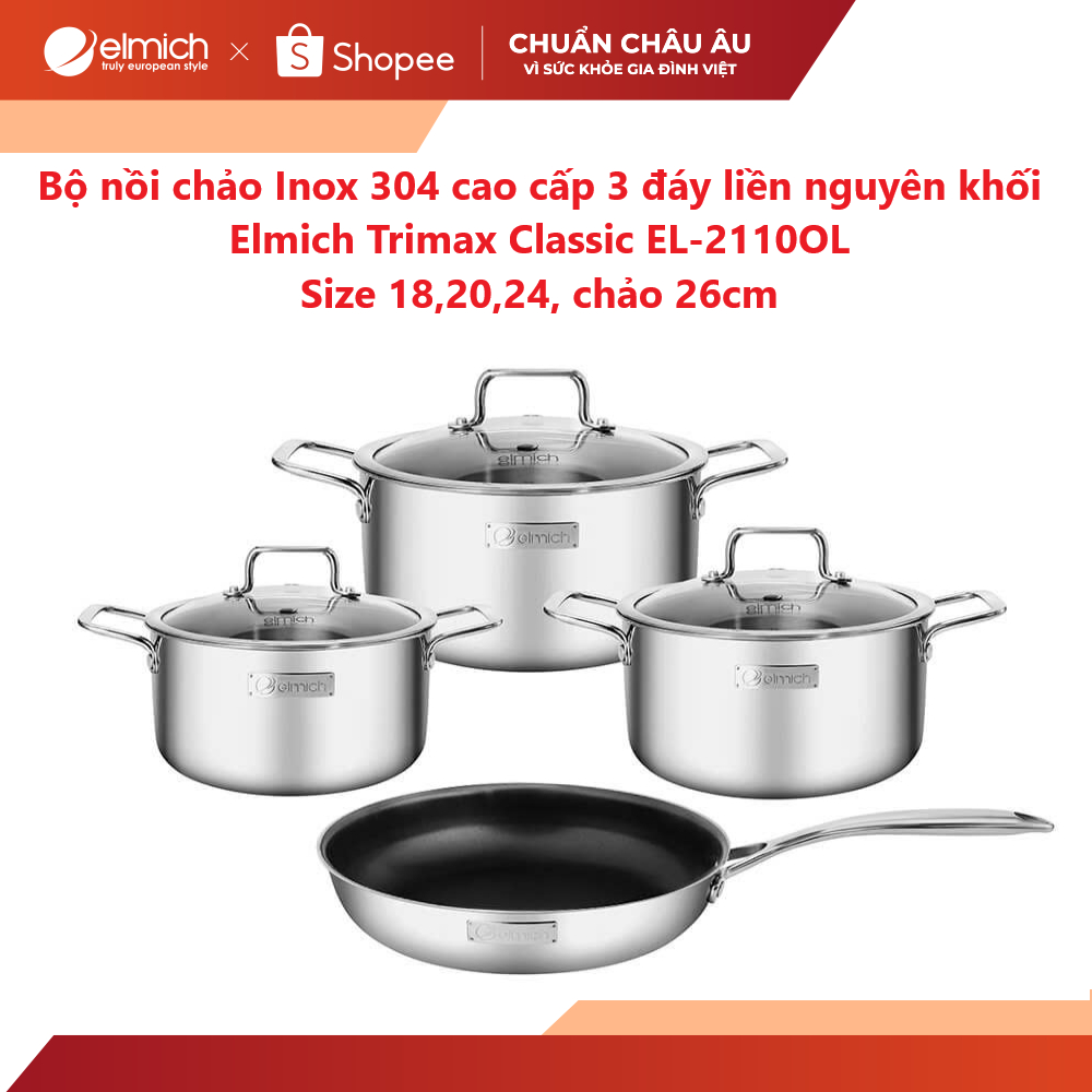 [LIFEMCMBP4 -12% đơn 250K] Bộ nồi chảo Inox 304 cao cấp 3 đáy liền nguyên khối Elmich Trimax Classic EL-2110OL