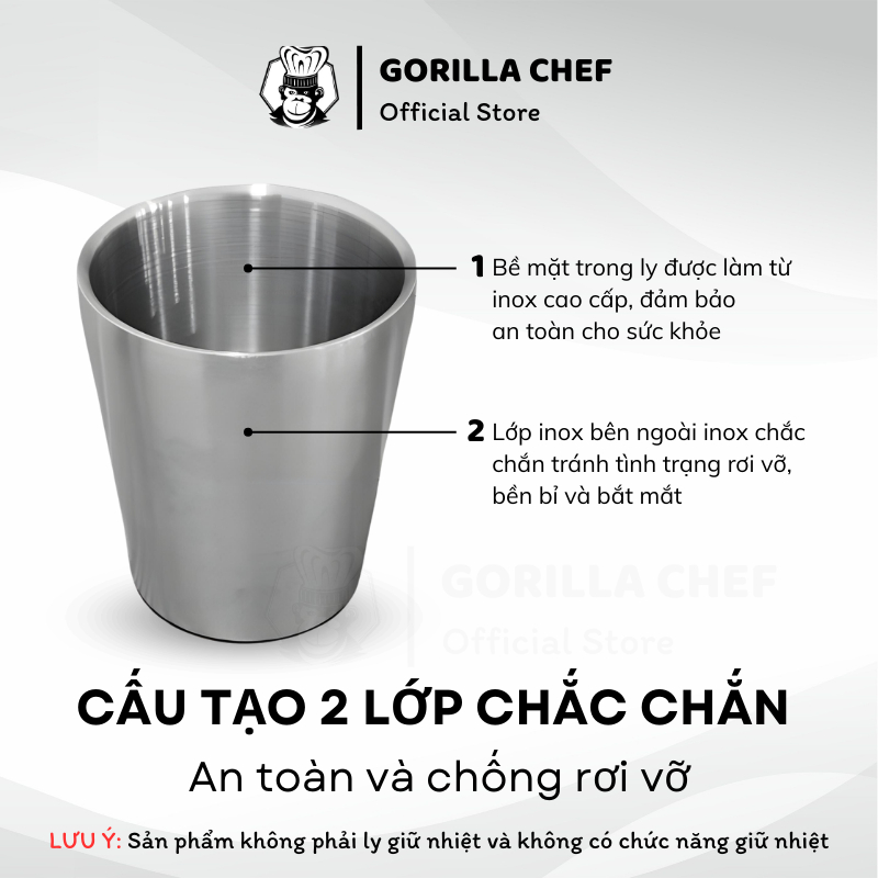 Ly inox 2 lớp 300/350/450ml GORILLA CHEF thiết kế đơn giản, sang trọng không giữ nhiệt