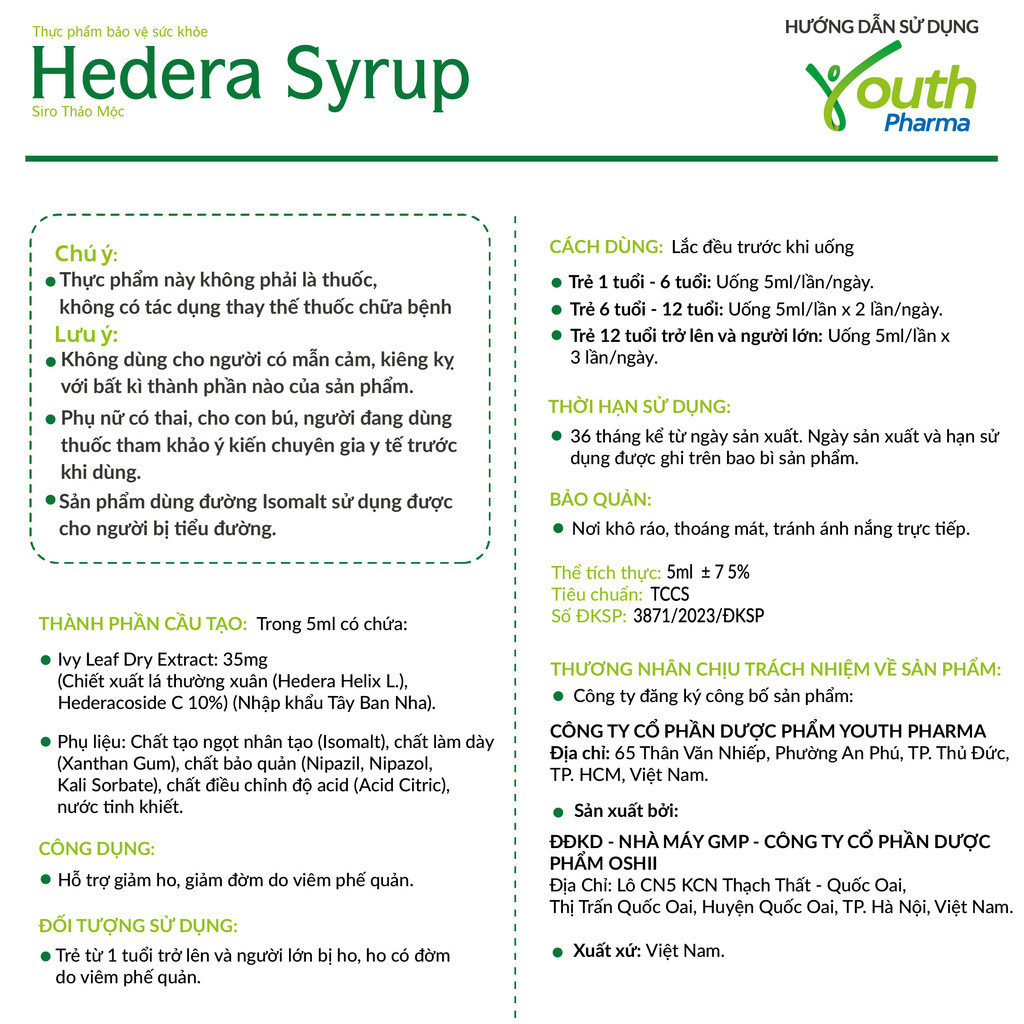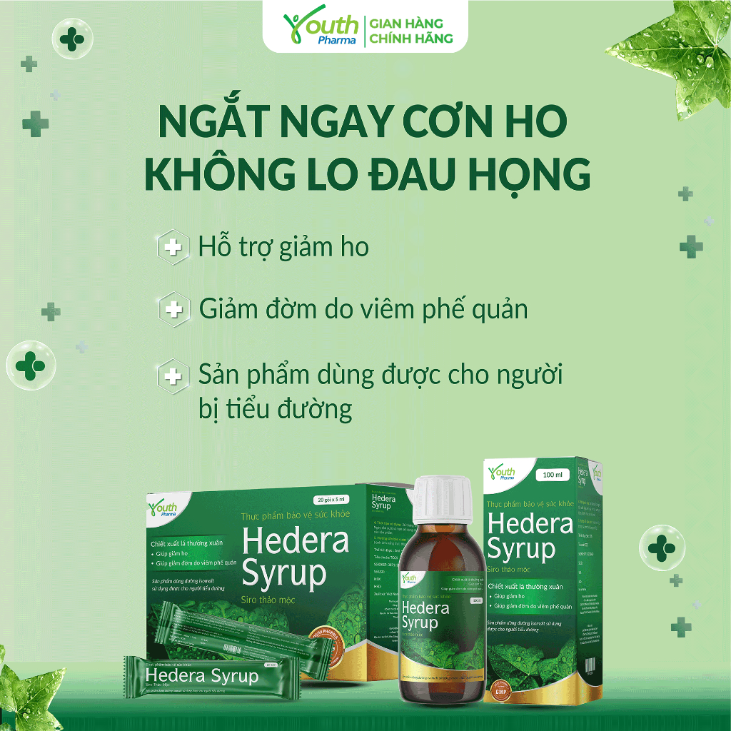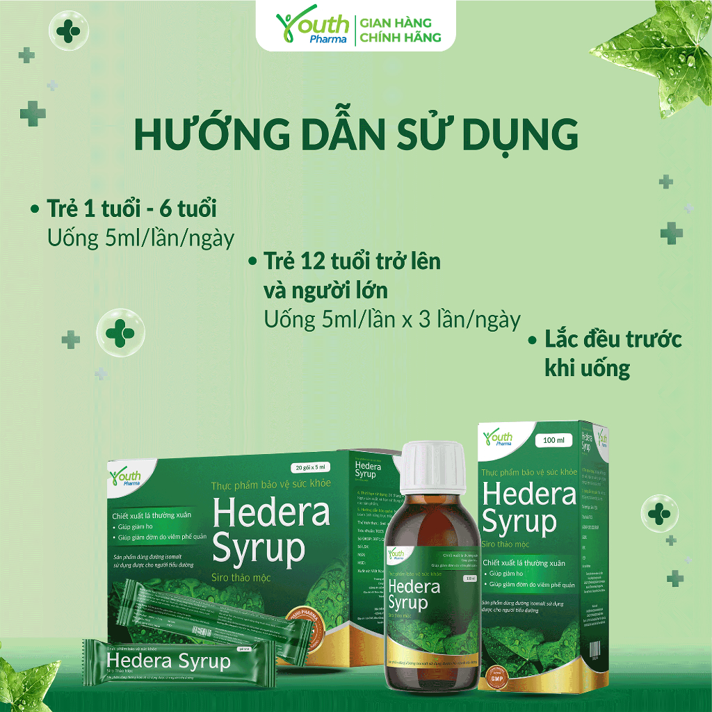 Siro Ho Hedera Syrup Youth Pharma Hỗ Trợ Giảm Ho, Giảm Đờm - Hộp 20 Gói 5ml