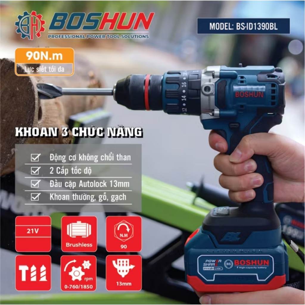 Máy Khoan Pin Boshun BS-ID1390BL Không chổi than-Có búa-Khoan 3 chức năng 13mm-Khoan Pin Lõi Đồng
