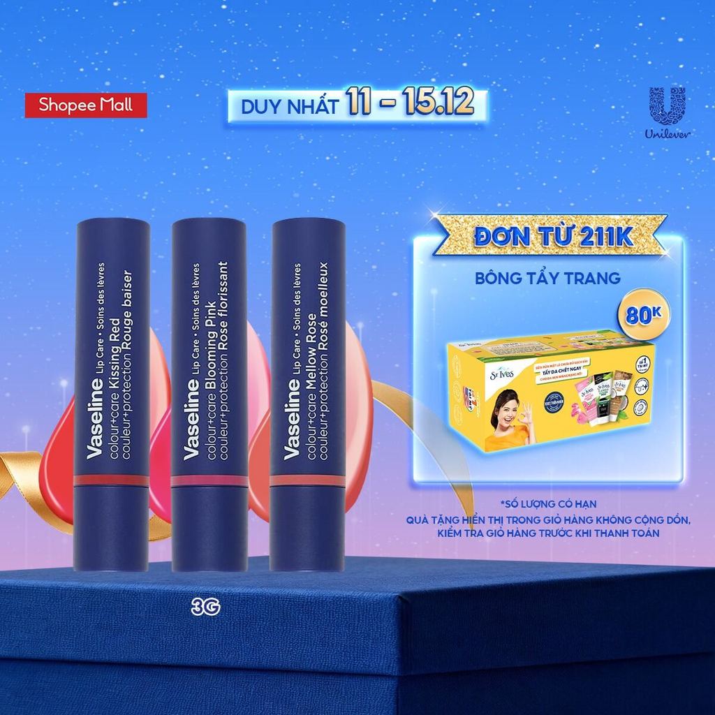 Son dưỡng môi Vaseline Colour+Care 3g (Mellow Rose/Kissing Red/Blooming Pink)