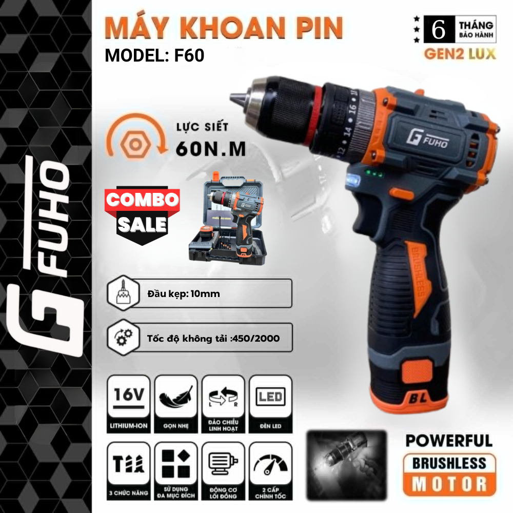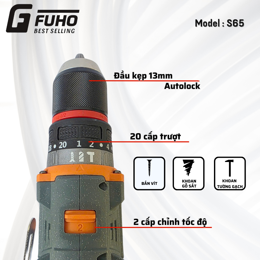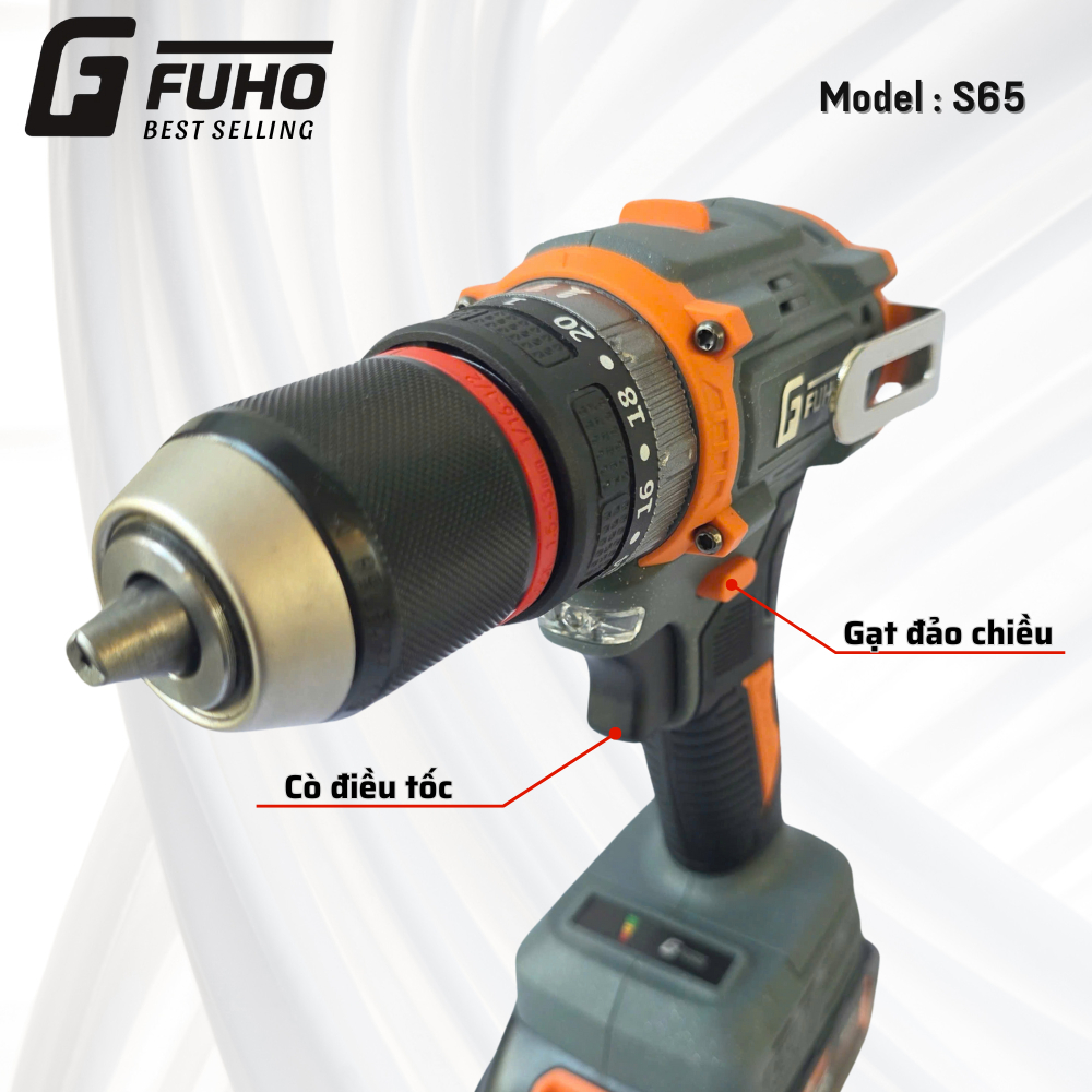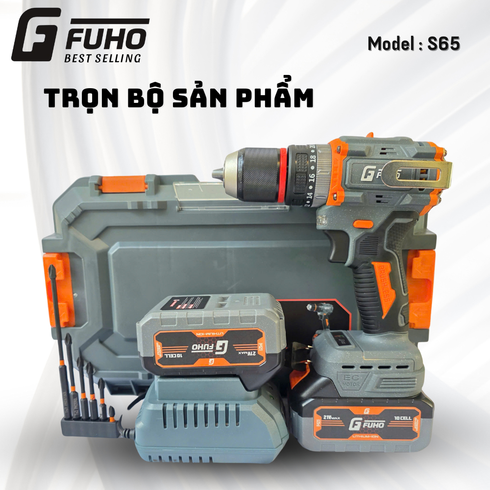 Máy khoan Pin Fuho S65 3 chức năng - Đầu autolock 13mm - Động cơ không Chổi Than tặng kèm 6 Mũi vít cao cấp