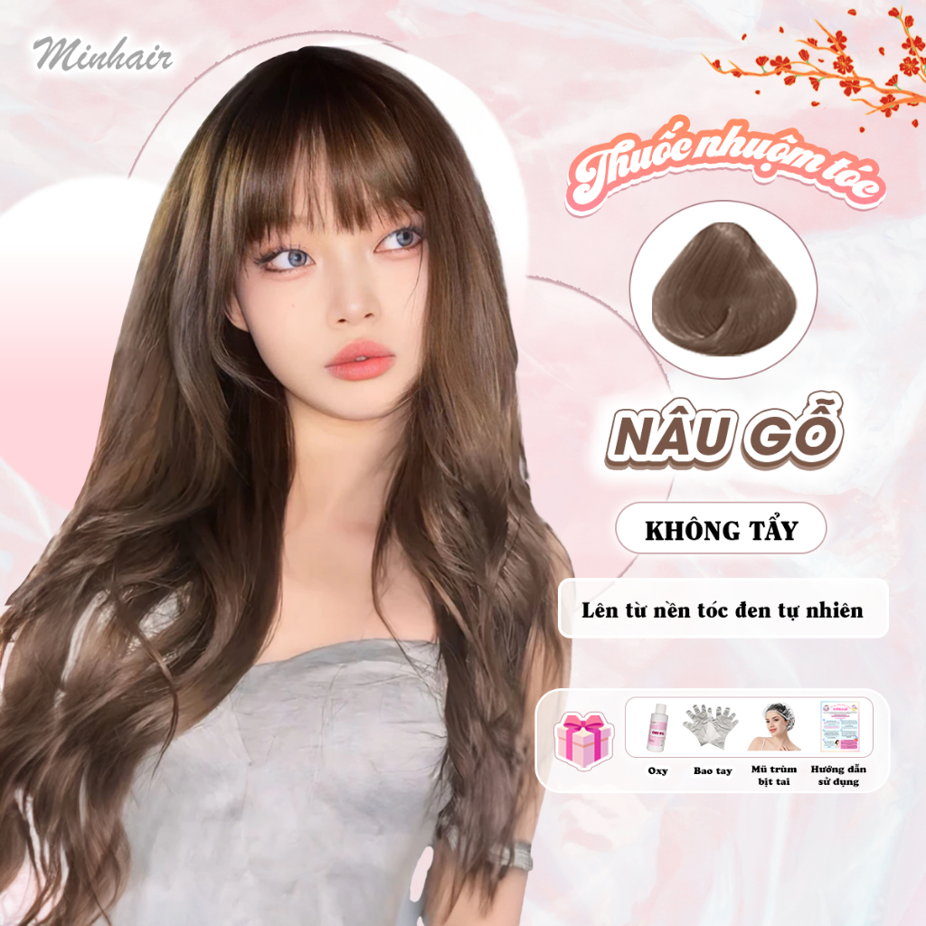 Thuốc nhuộm tóc nâu, Thuốc nhuộm tóc màu Nâu Gỗ, MinHair, tặng kèm oxy trợ dưỡng và bao tay