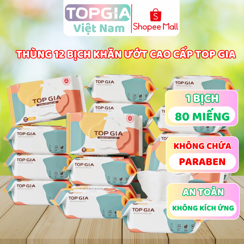 Khăn ướt rút cao cấp TopGia 12 bịch 80 tờ dày, mềm mại không mùi không parabens dùng được cho em bé