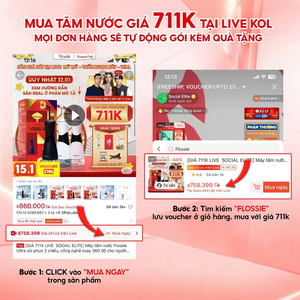 [787K LIVE SHOP] Máy tăm nước Flossie Ultra với vòi phun 2 chiều công nghệ đầu xoay 360 độ làm sạch nhanh, KOC