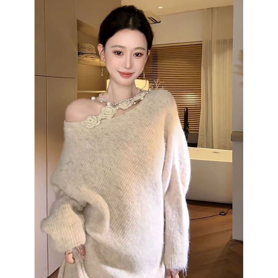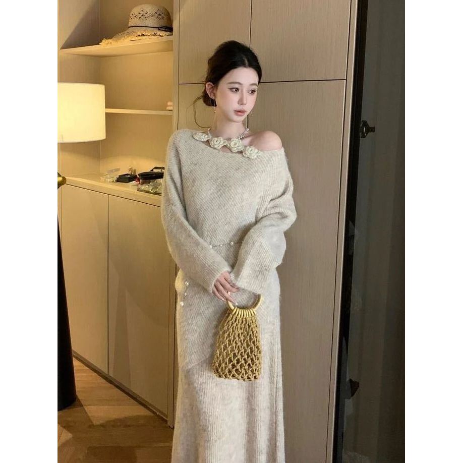Pháp Phong Cách Nhẹ Nhàng Hoa Ba Chiều Thiết Kế Rời Không Đều Tính Khí Áo Len Váy Dệt Kim Hai @ -
