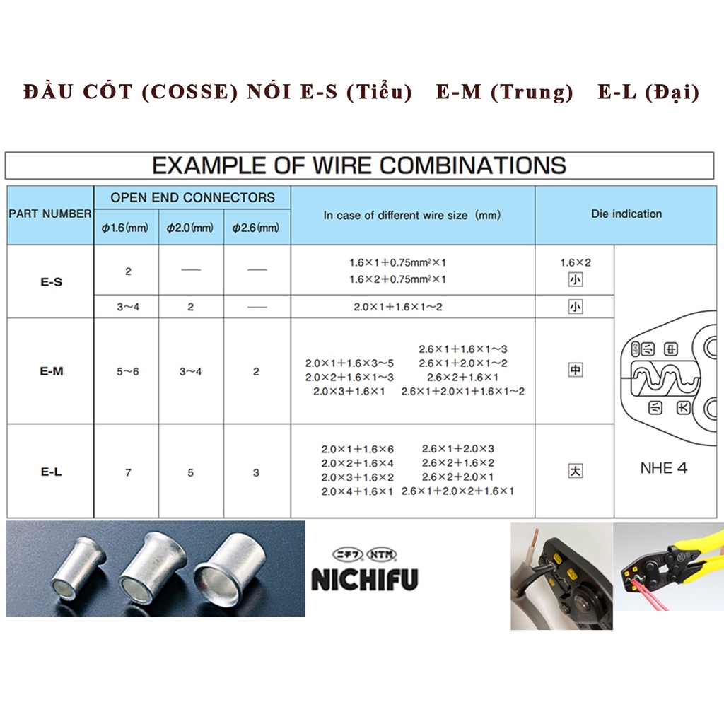 Đầu cos Nichifu bằng đồng bấm nối dây điện E-S Tiểu, E-M Trung, E-L Đại nhật bản