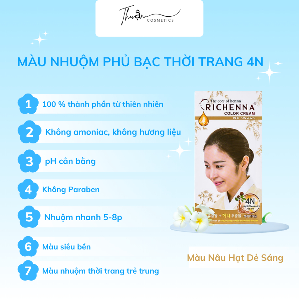 Kem Nhuộm Phủ Bạc Thảo Dược Hồng Sâm Tại Nhà Richenna Hàn Quốc Tone 4N Light Chestnut Hạt Dẻ Sáng 60*60g