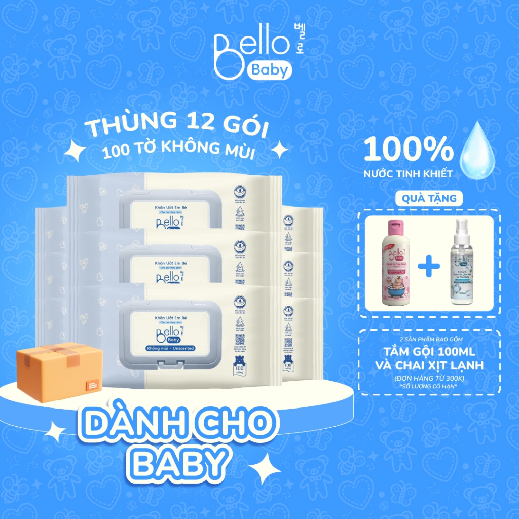 Combo Bello Baby Gói Khăn ướt cho bé Bello 100 tờ không mùi, không cồn, không Paraben, ngừa hăm