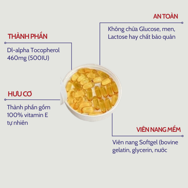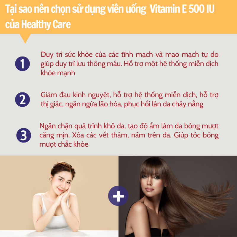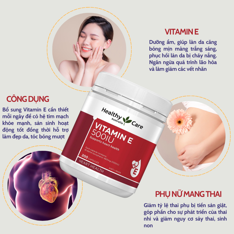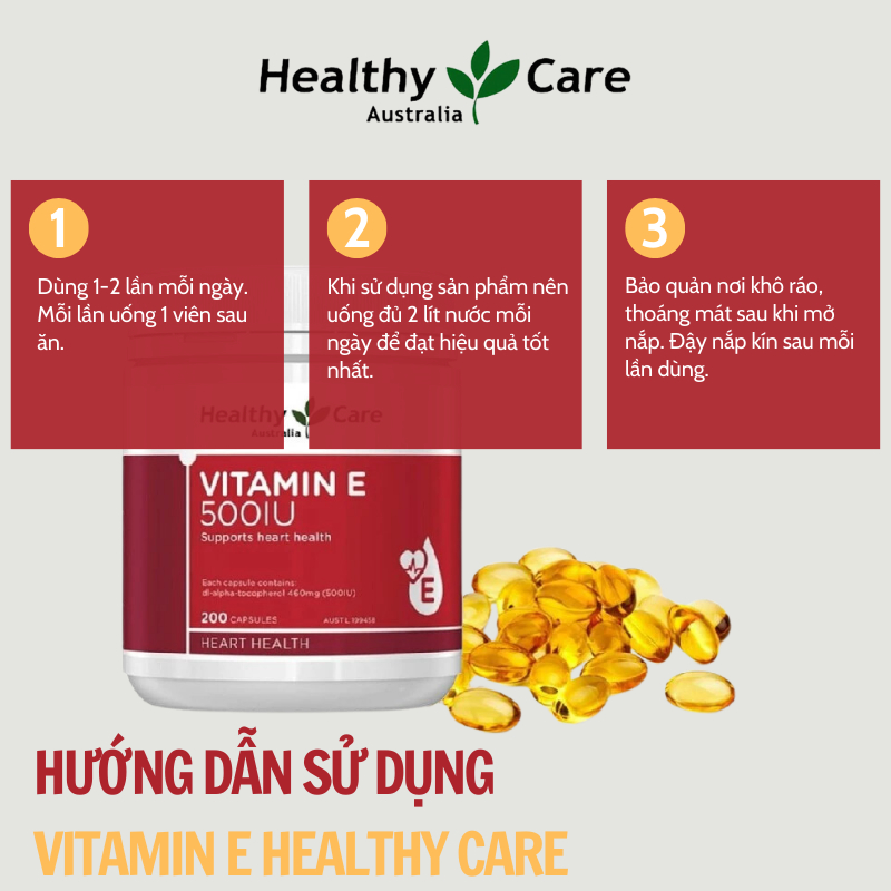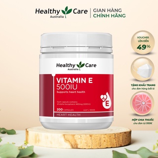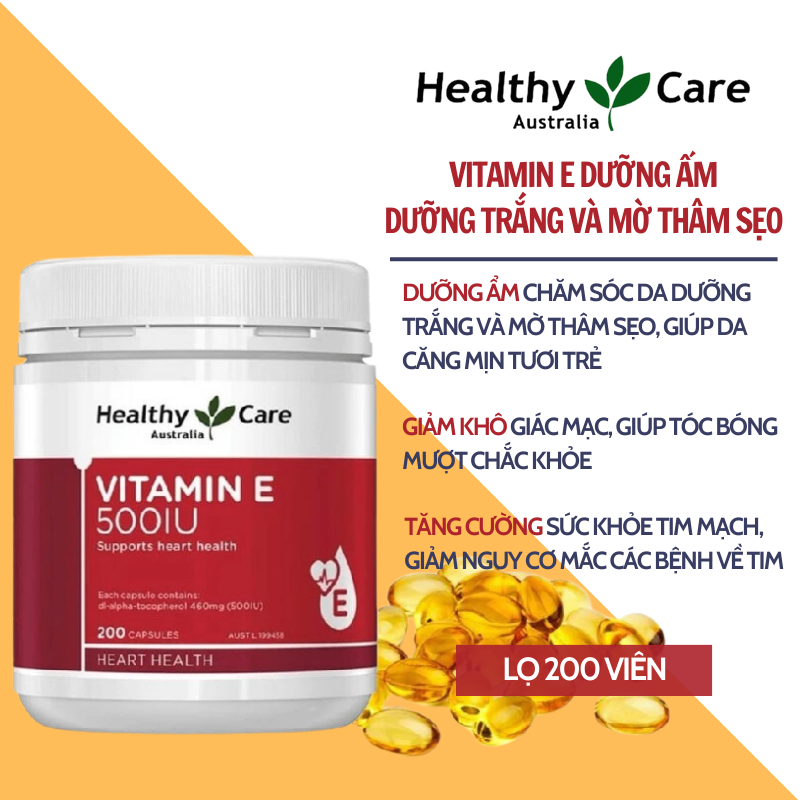Vitamin E Healthy Care 500IU Úc dưỡng ẩm dưỡng trắng và mờ thâm sẹo, giúp da căng mịn hộp 200 viên