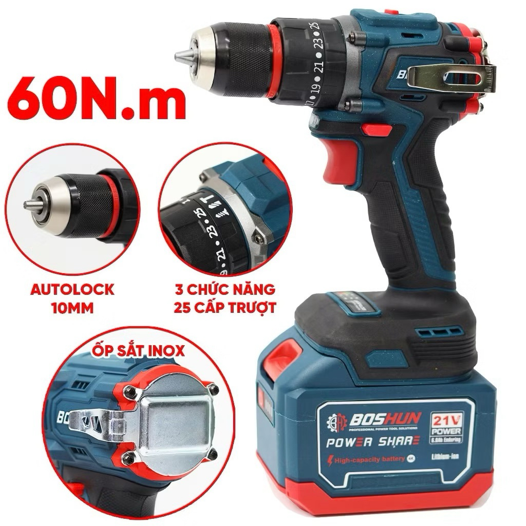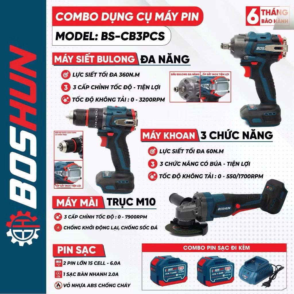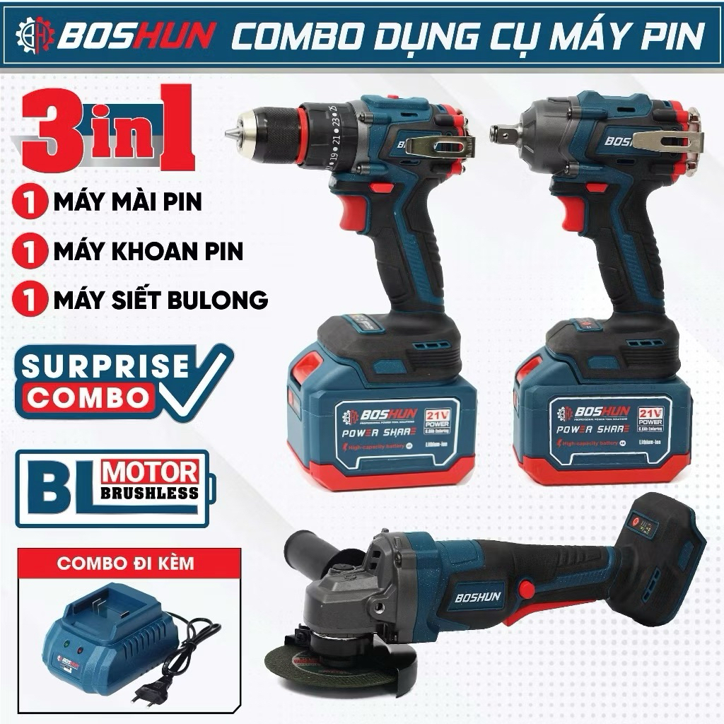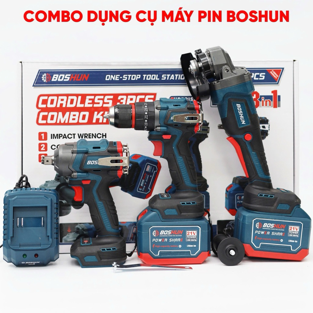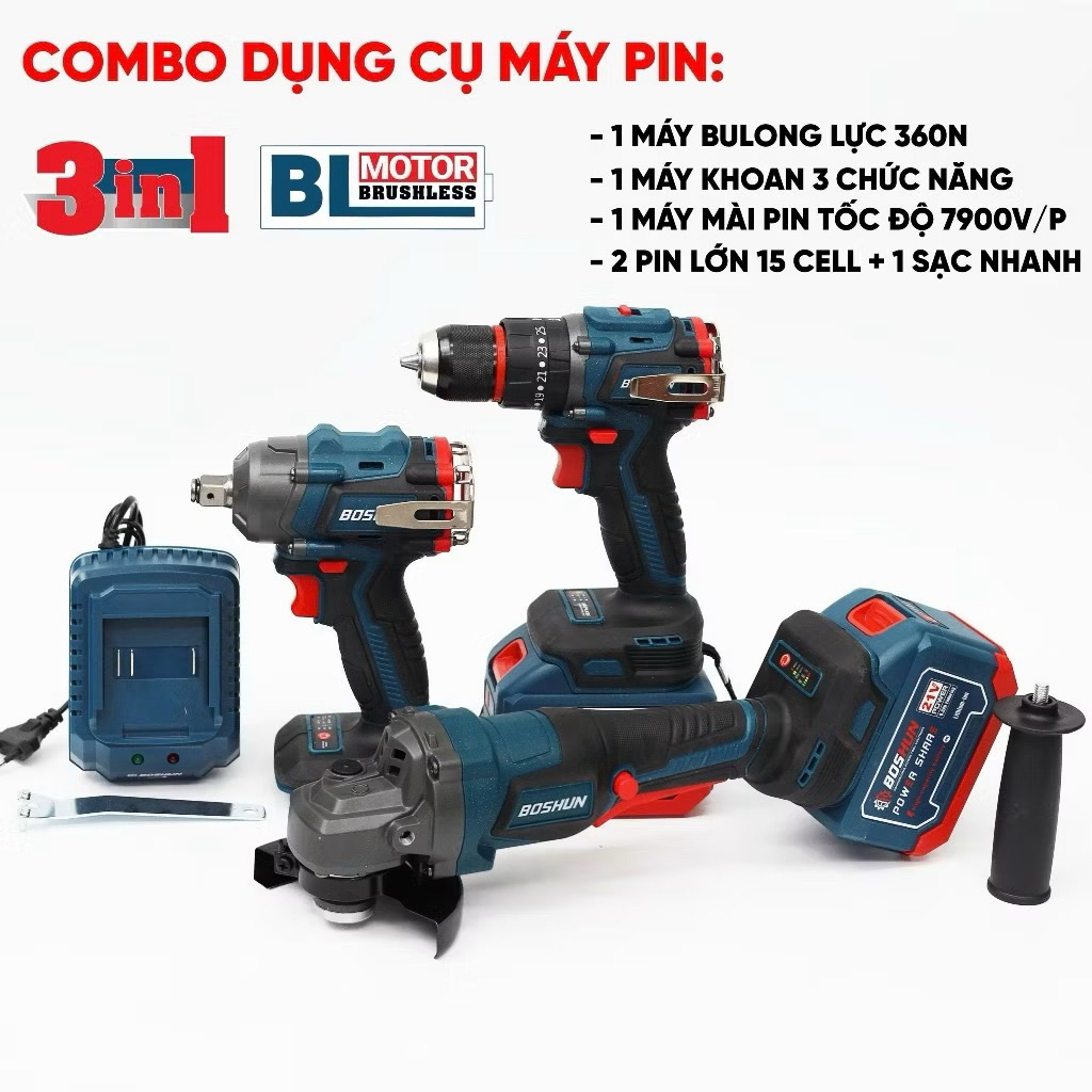 Bộ Combo 3 Máy khoan, Máy Mài, Máy Bulong Boshun BS-CB3PCS , 2 Pin 15Cell Động Cơ Không Than