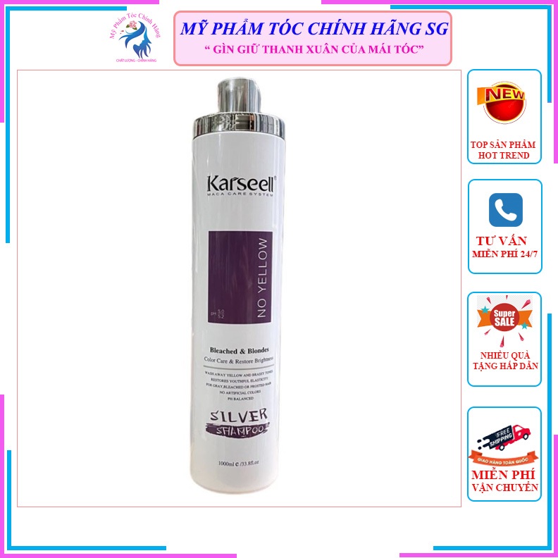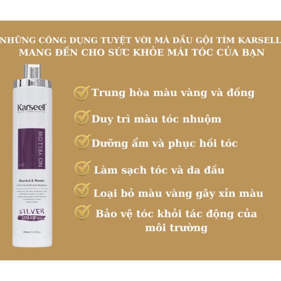 Dầu gội tím khử vàng cho tóc tẩy, nhuộm màu tones lạnh Karseell SILVER No Yellow Shampoo 1000ml