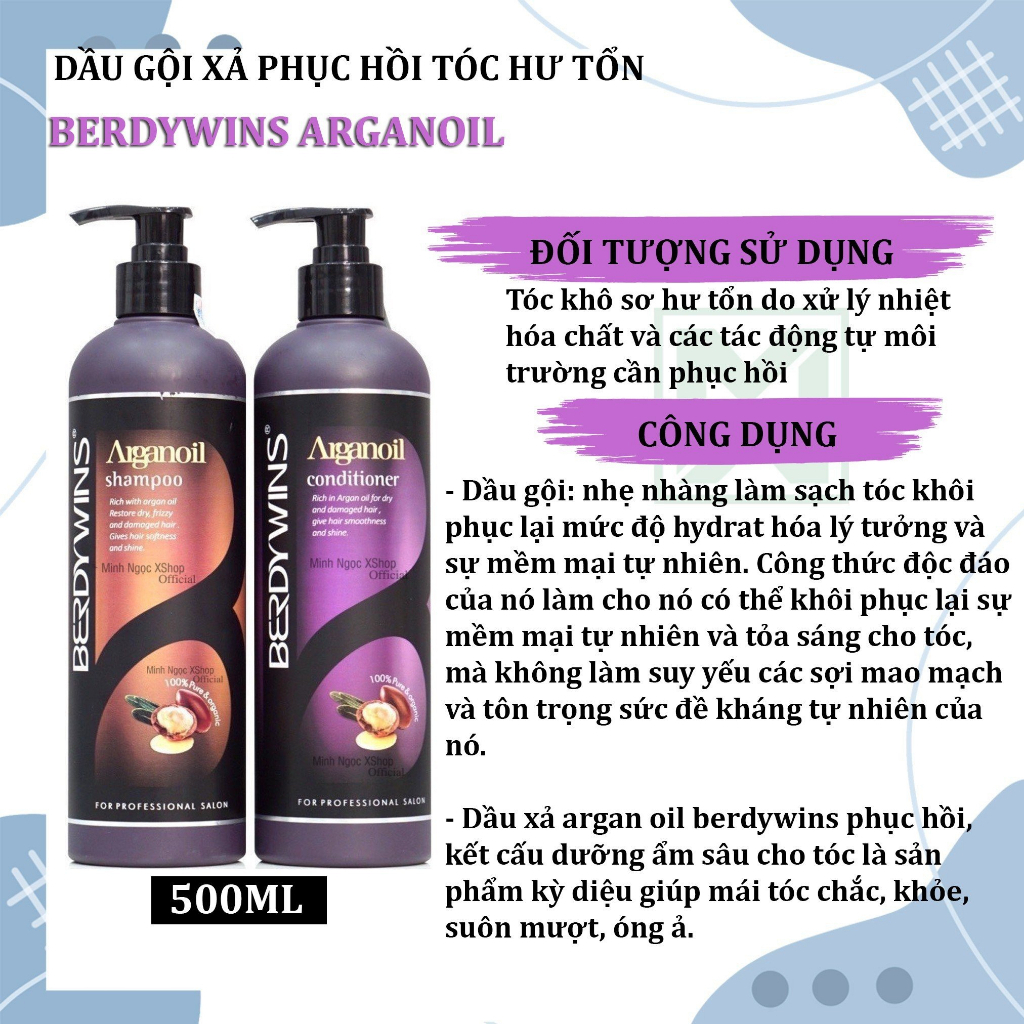 Dầu Gội Dầu Xả BERDYWINS ARGAN OIL 1000ML * 2 Phục Hồi Tóc Hư Tổn, Chống Rụng Tóc, Tái Tạo Sợi Tóc