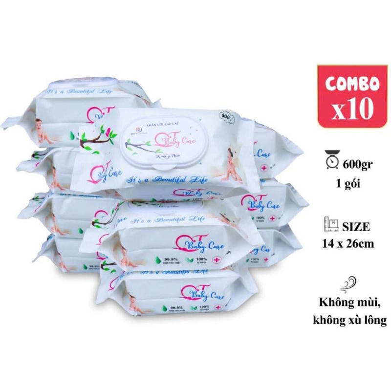 [Combo 10 gói] Khăn ướt cao cấp cho bé sơ sinh không mùi, không parapen, ăn toàn cho bé sơ sinh QT Baby Care 600gr