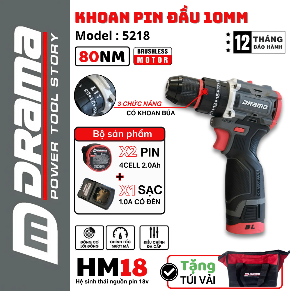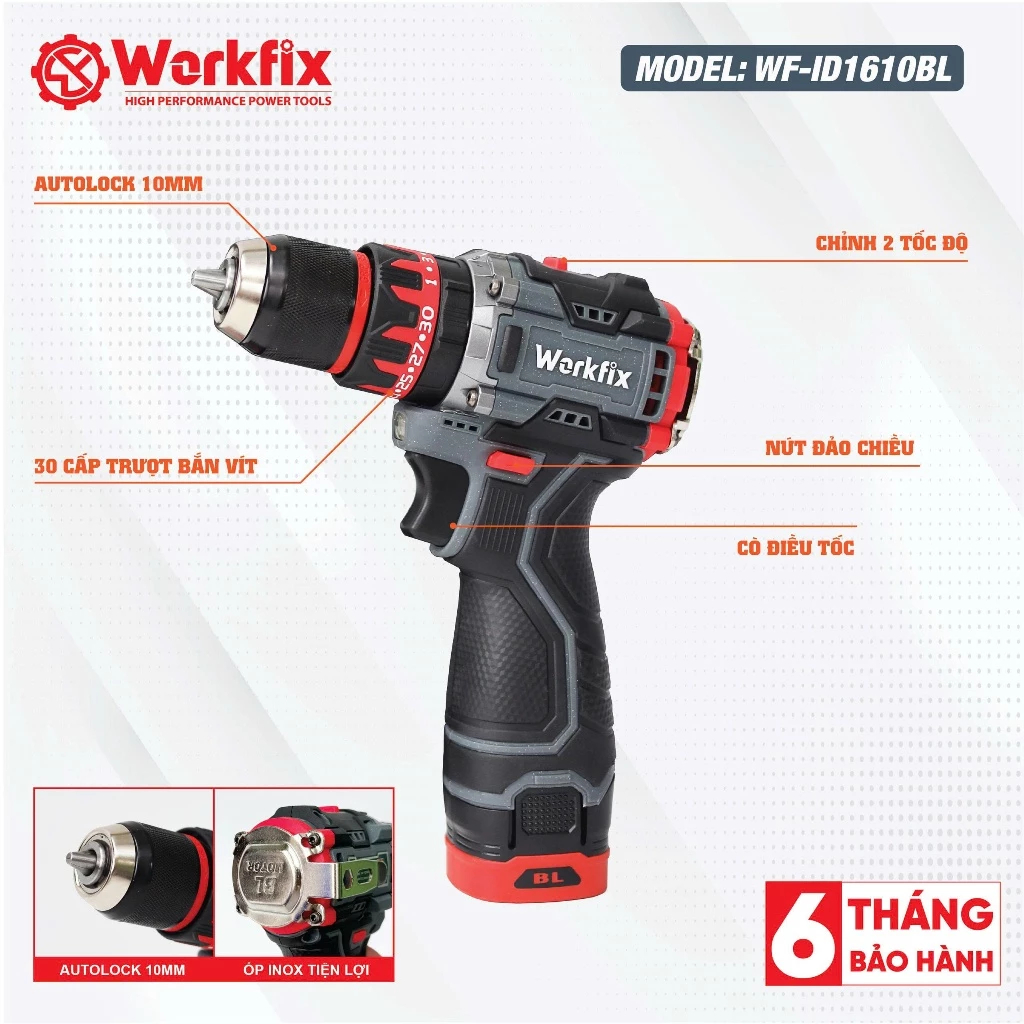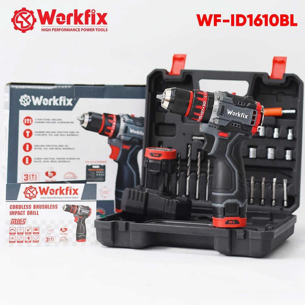 Máy khoan pin WORKFIX WF-ID1610BL, Động cơ Không chổi than, 3 Chức năng 10mm, Có khóa trục, Tặng 24 Phụ kiện