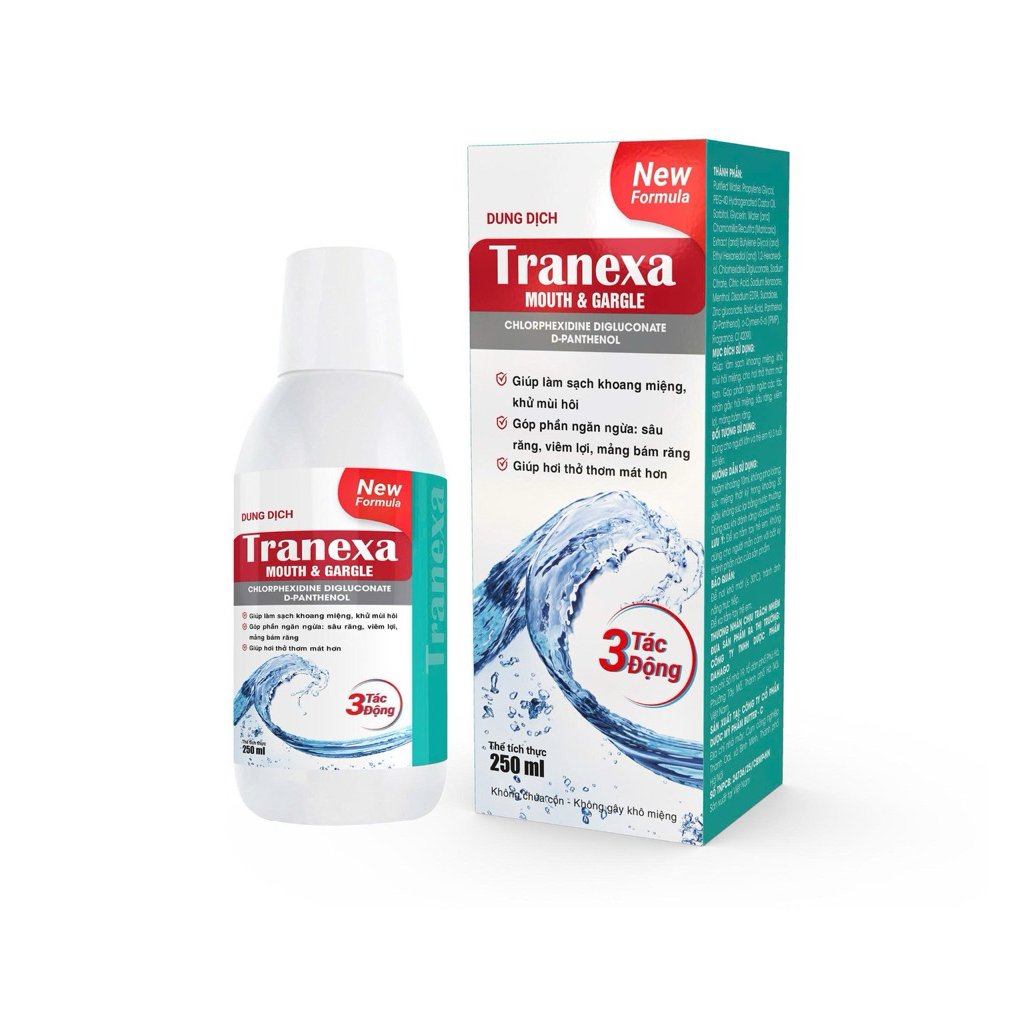Nước súc miệng Tranexa Mouth & Gargle hỗ trợ làm sạch miệng, khử mùi hôi, ngăn ngừa sâu răng, viêm lợi, tan mảng bám.