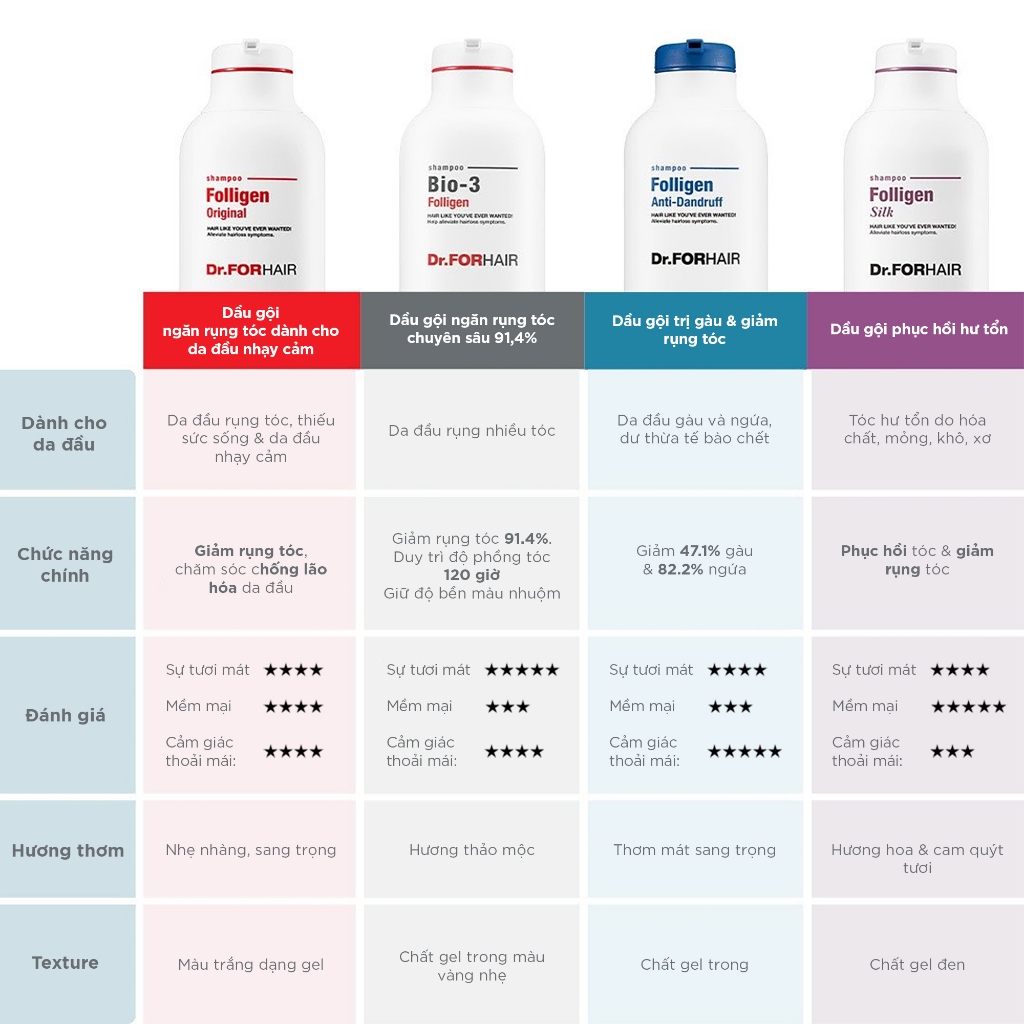 TỔNG HỢP DẦU GỘI DR. FOR HAIR CHAI 500ML FOLLIGEN ORIGINAL PHYTO FRESH SILK BIO-3 COOLING ANTI DANDRUFF