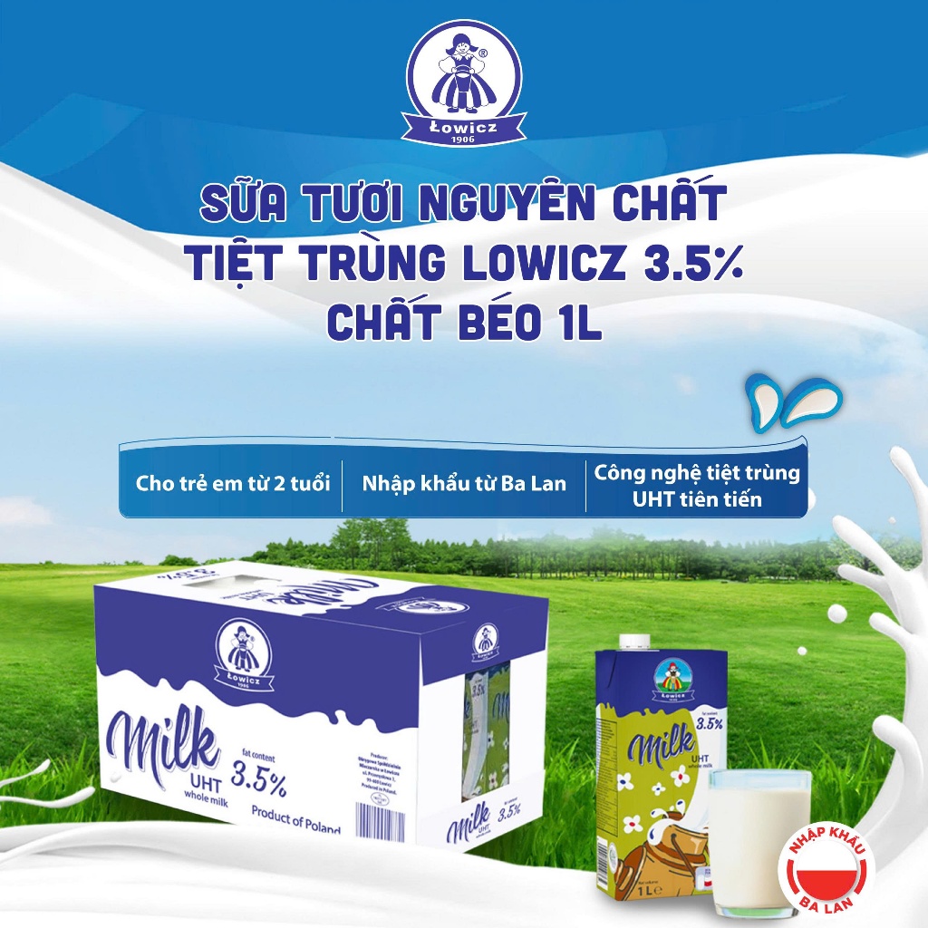 Thùng 12 Hộp Sữa Tươi Nguyên Chất Łowicz UHT 3.5% Béo 1 Lít (Ba Lan) - Tối Ưu Cho Gia Đình, Giàu Canxi & Protein