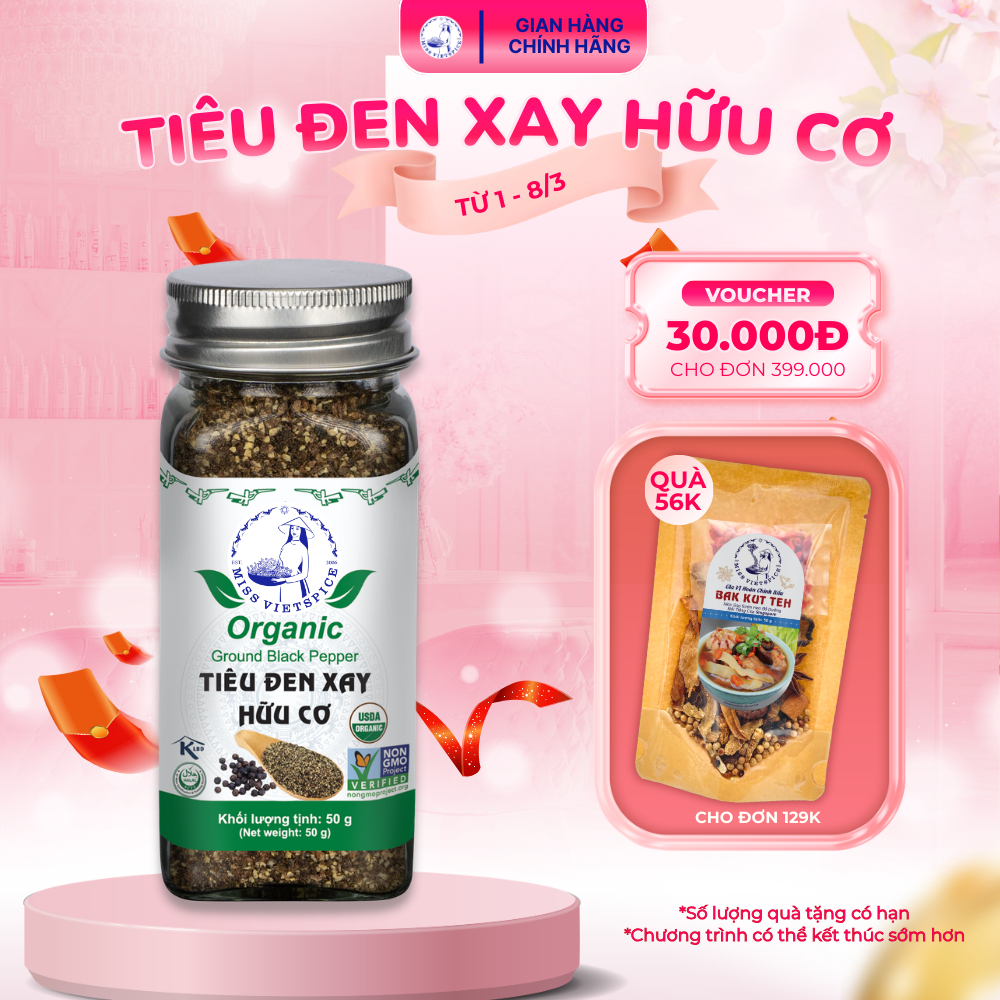Tiêu đen xay hữu cơ Miss Vietspice hũ 50g, 100% nguyên liệu sạch tự nhiên, đóng hũ tiện dụng