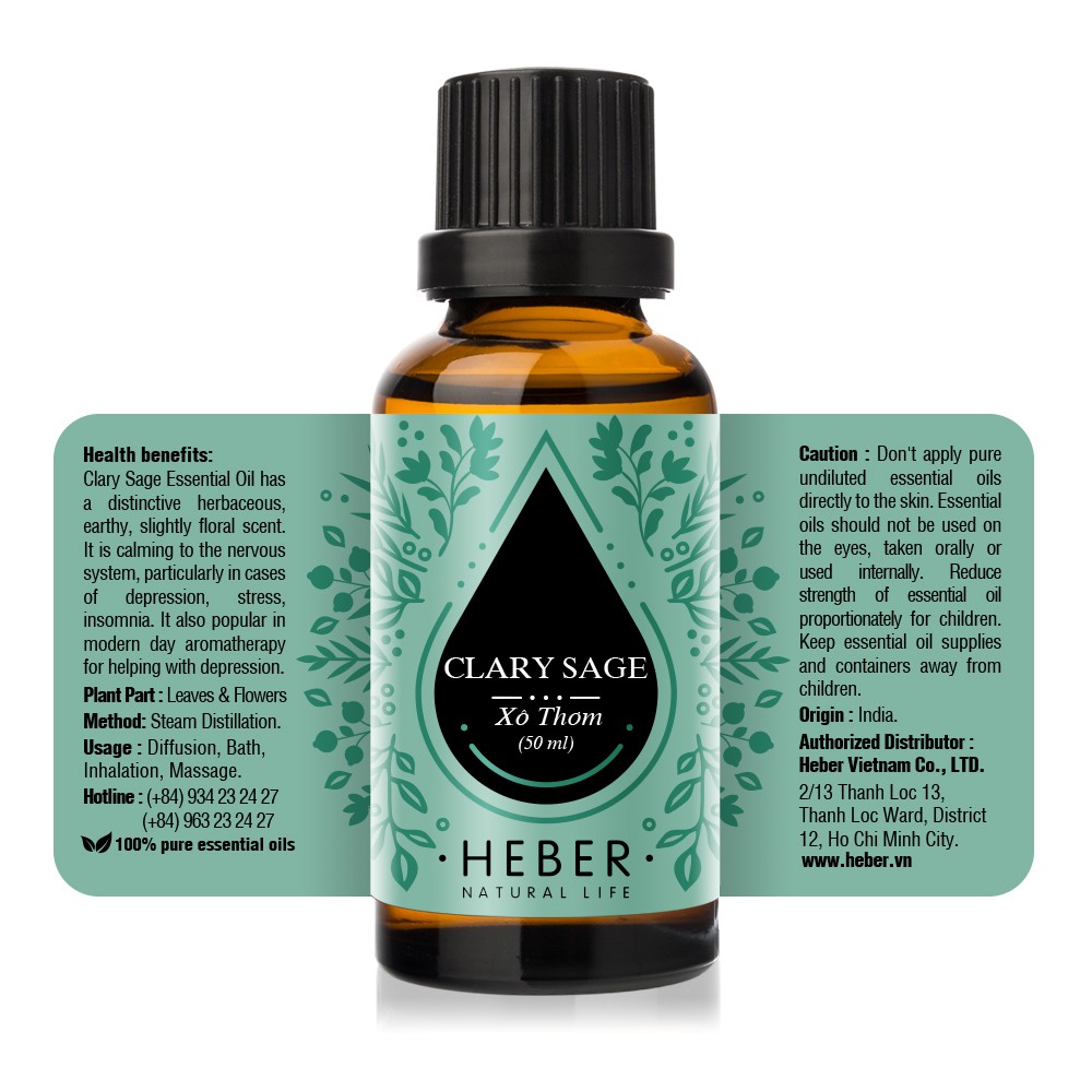 Tinh Dầu Xô Thơm Clary Sage Heber Natural Life, Thiên Nhiên Nguyên Chất Cao Cấp, 10ml/30ml/50ml