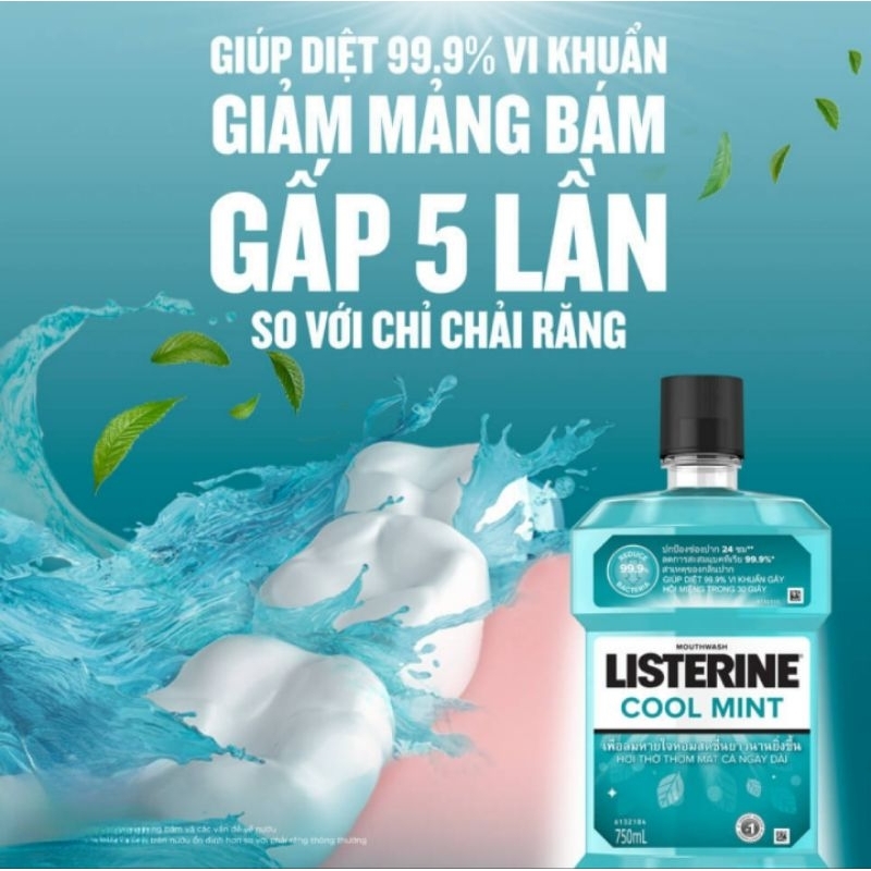 Nước súc miệng Listerine Coll Mint diệt khuẩn,sạch mảng bám trên răng,hơi thở thơm mát dài lâu,dung tích 250ml và 750ml.