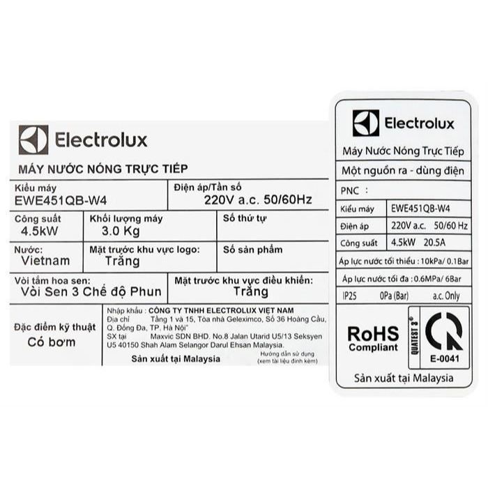 Máy nước nóng trực tiếp có bơm trợ lực Electrolux 4500W EWE451QB-W4 ( hàng xã kho giá rẻ - bảo hành chính hãng )