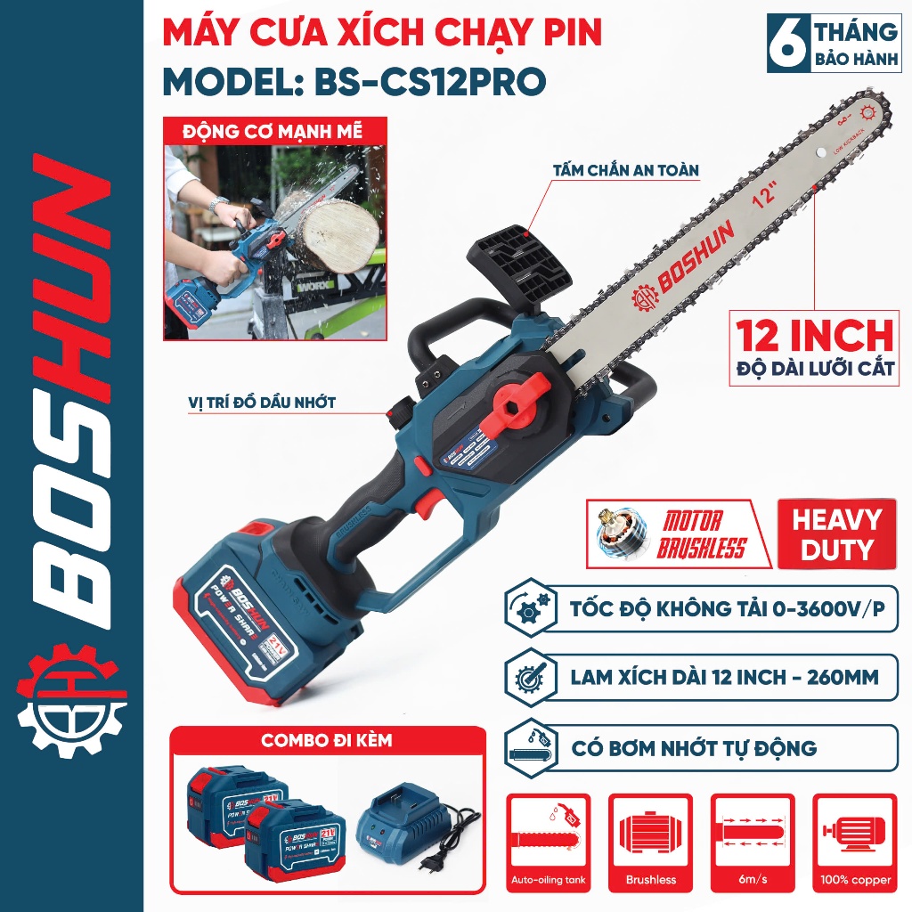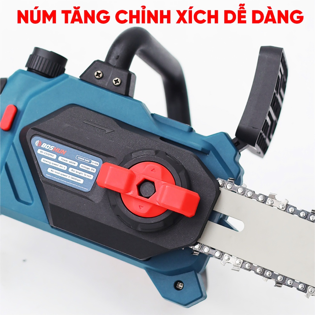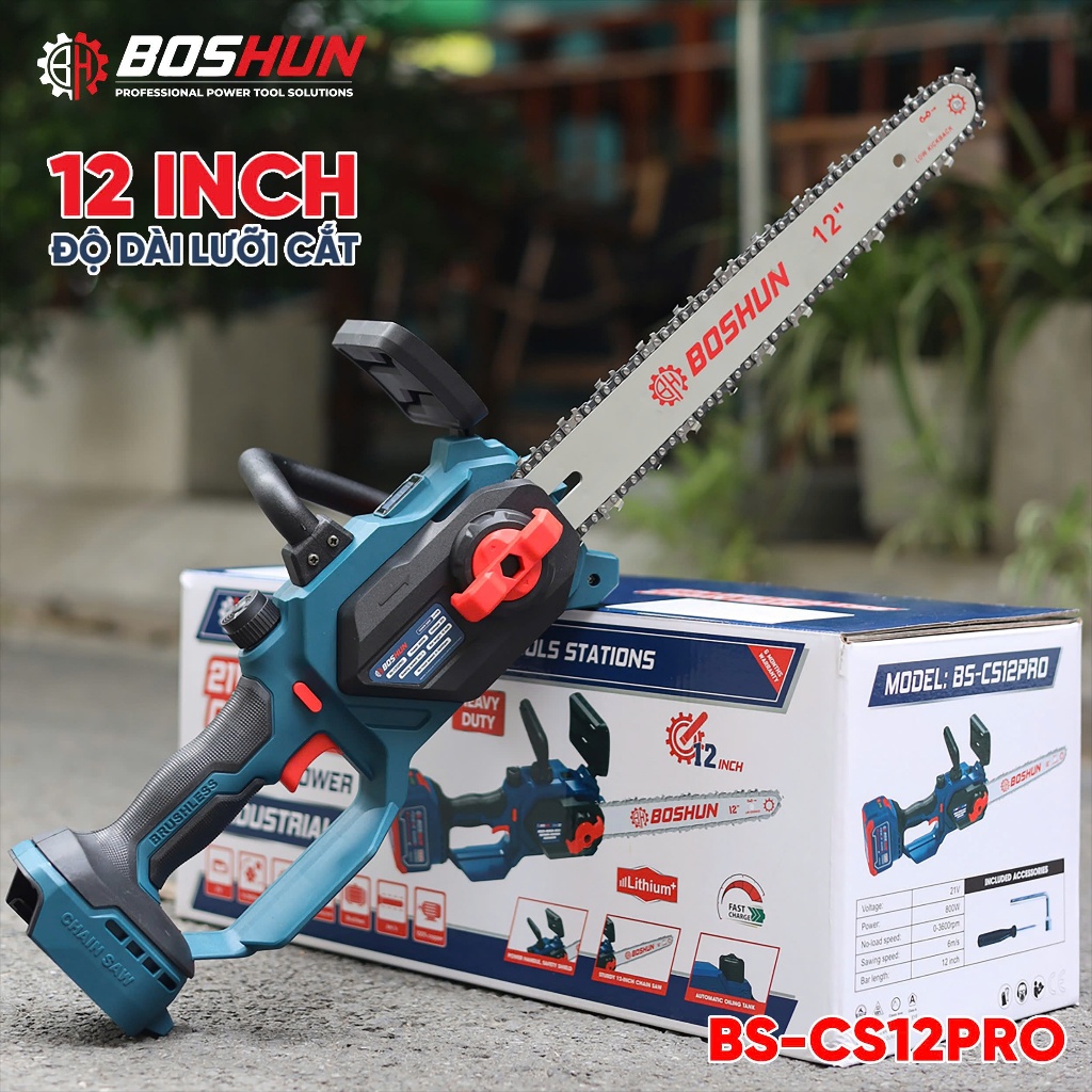 Máy Cưa Xích Pin Lam 12inch Chính Hãng Boshun Bs-CS12PRO, Có Tra Nhớt Tự Động, Lam Nhỏ-Tốc Độ Nhanh Hơn