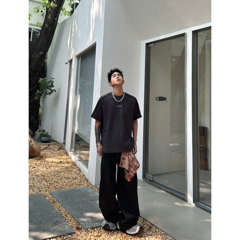 Quần jeans nam ống rộng Unisex Retro Mỹ Điểm nhấn khăn vuông kẻ ca rô Streetwear form rộng thoải mái thiết kế Scimitar