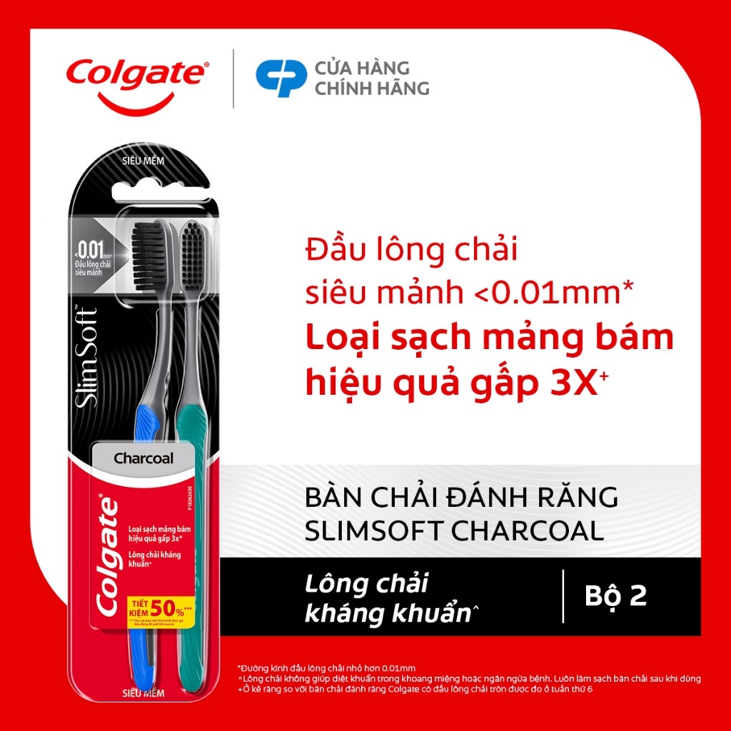 Bộ 2 bàn chải Colgate SlimSoft Charcoal than hoạt tính kháng khuẩn siêu mềm mảnh