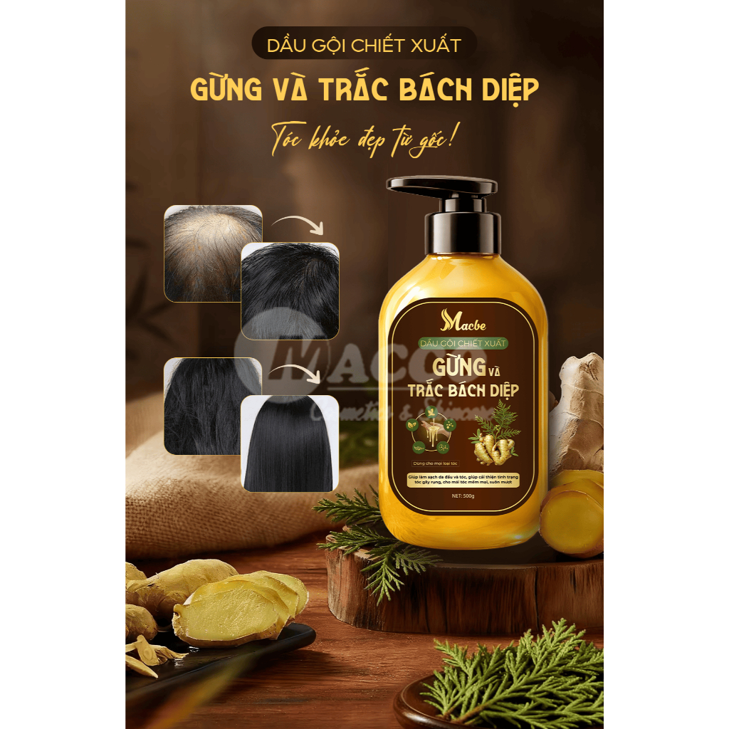 [PHIÊN BẢN 2026] Dầu Gội Chiết Xuất Gừng và Trắc Bá Diệp Macbe (500ml) Làm Sạch Da Đầu, Ngăn Rụng Tóc, Tóc Mềm Mượt