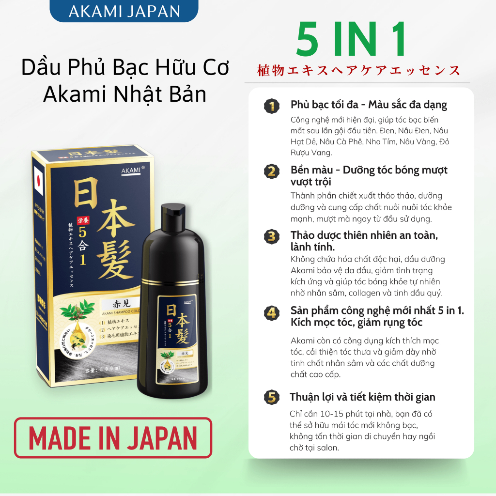 [Combo Gội Xả] Dầu gội nhuộm phủ bạc AKAMI 5 in 1 Nhật Bản tóc cao cấp trong 5 phút 500ml