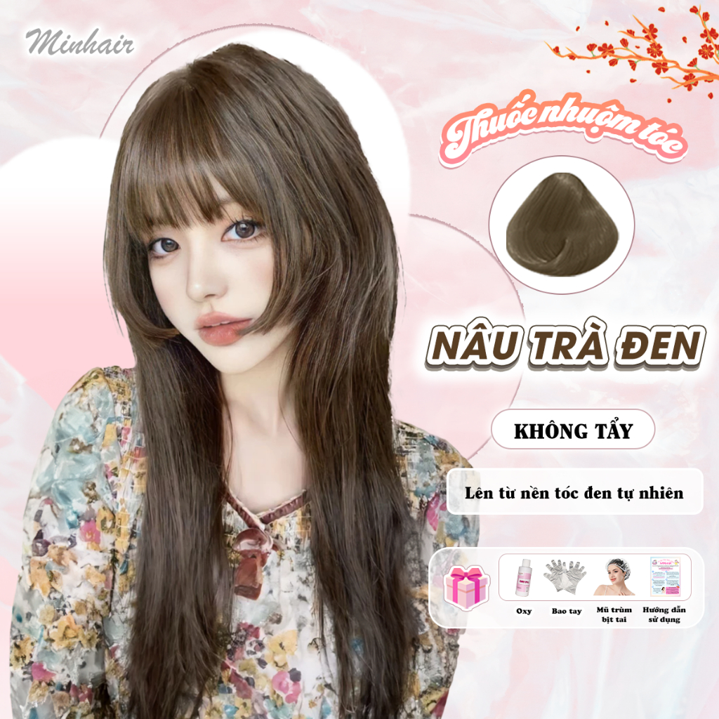 Thuốc nhuộm tóc nâu, thuốc nhuộm tóc Nâu Trà Đen, MINHAIR, tặng kèm oxy trợ dưỡng và bao tay