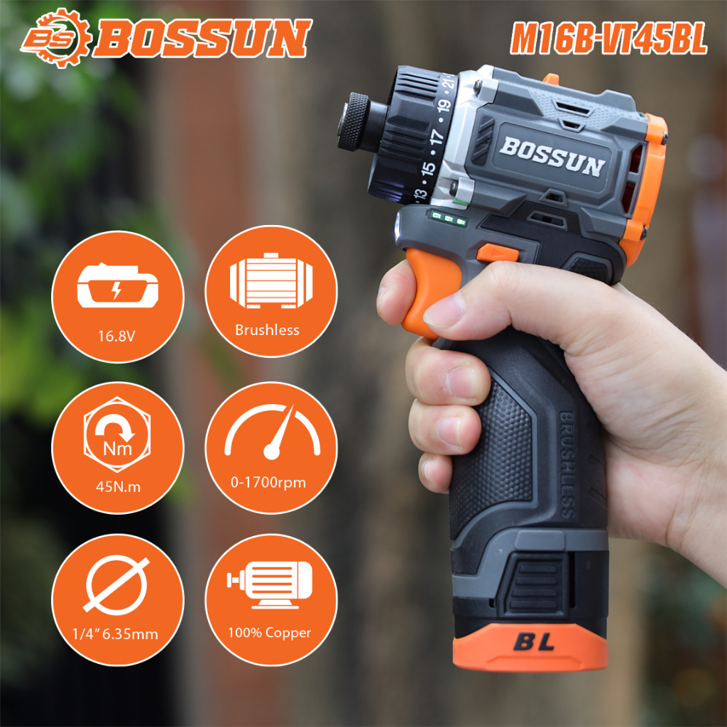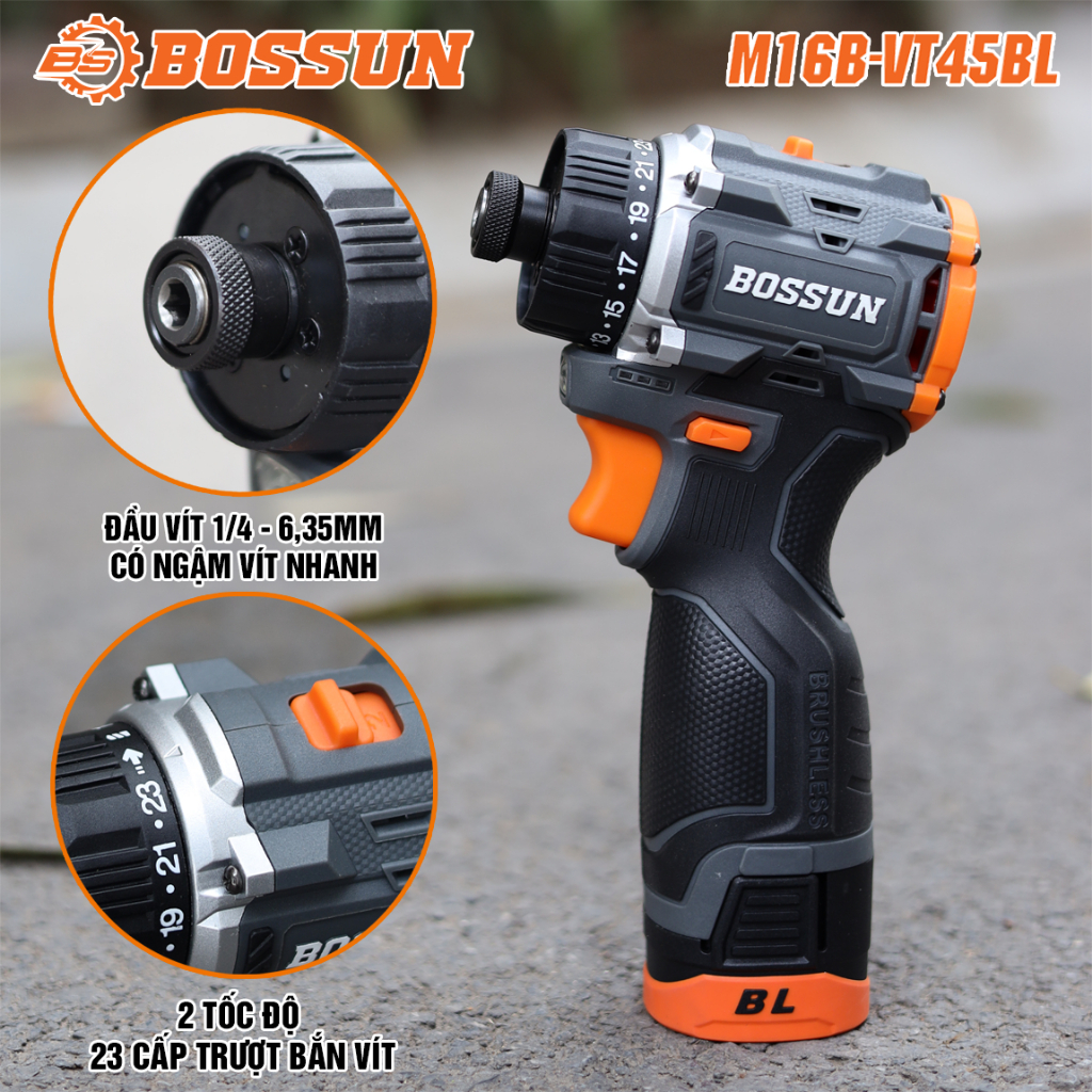 Máy Chuyên Vít pin BOSSUN M16B-VT45BL, Không Chổi Than Cò Điều Tốc 23 Cấp Trượt, Ruột Đồng 100%, Không Chổi Than
