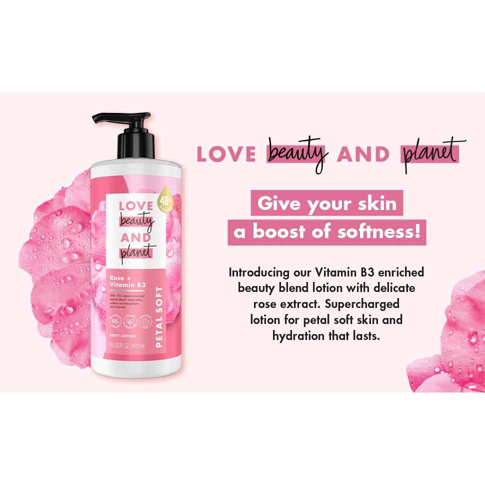 Sữa dưỡng thể Love Beauty And Planet 473ml -Rose + Vitamin B3/Shea butter + Vitamin E/Coconut Water (Mỹ)