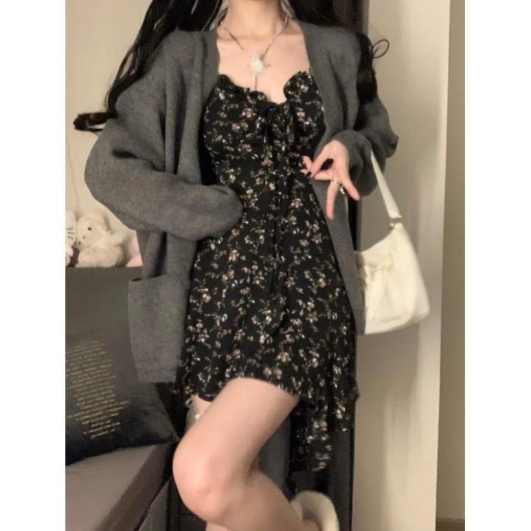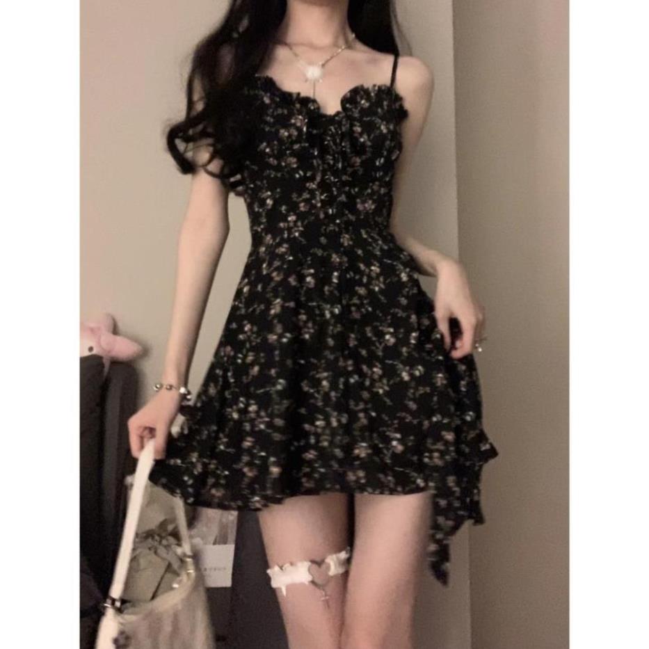 Váy Đầm Hoa Thiết Kế Lệch Tà Cá Tính Cao Cấp - Đầm 2 Dây Hoa Nhí Đen Tà Rủ A304