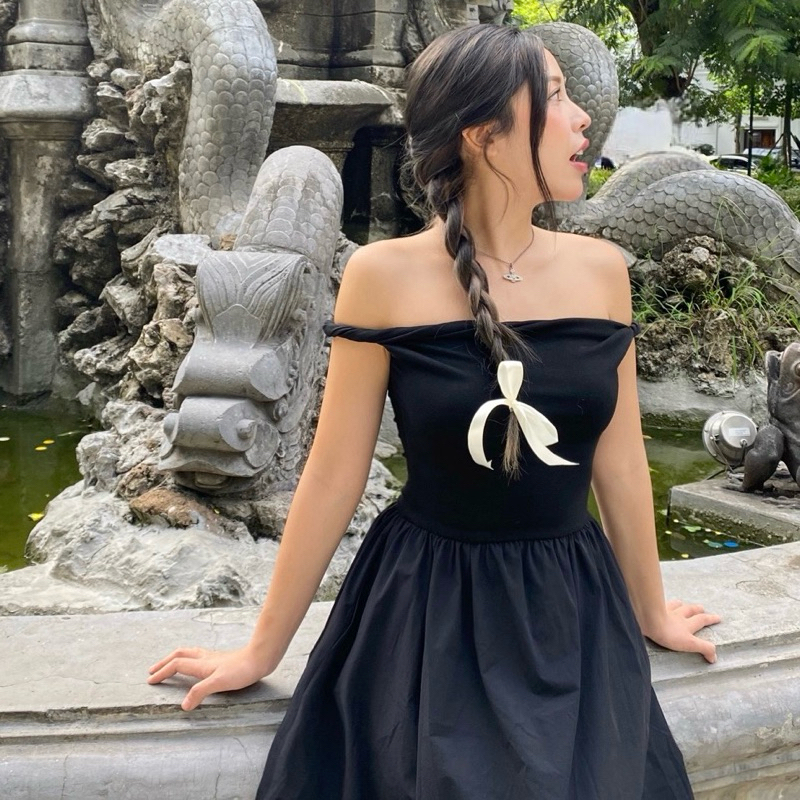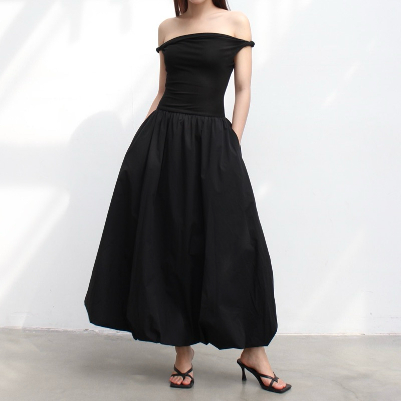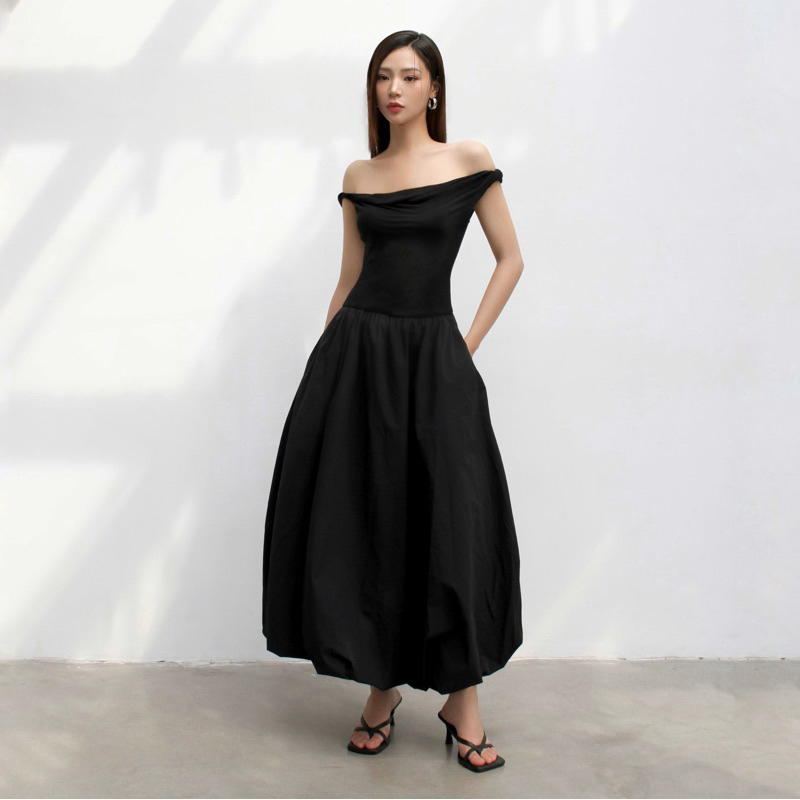 Váy dài dáng bí chiết eo trễ vai xoắn tay gấm vóc - váy “mơ”