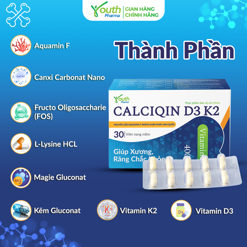 Canxi Calciqin D3 K2 Youth Pharma Bổ Sung Canxi, Giúp Xương, Răng Chắc Khỏe - Hộp 30 Viên