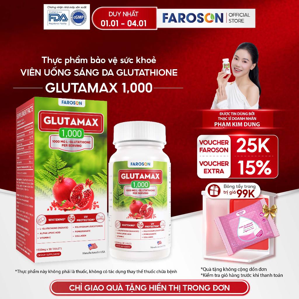 TPBVSK Viên Uống Trắng Da Glutathione Faroson Glutamax 1000 Sáng Da Giảm Nám Chống Nắng Hộp 30 Viên