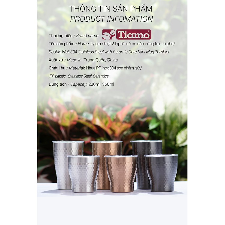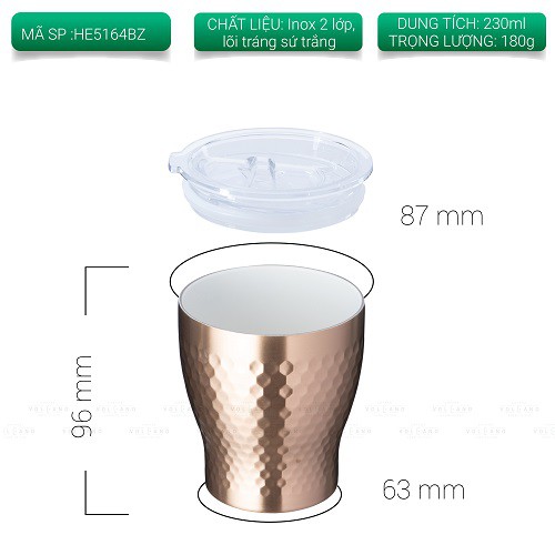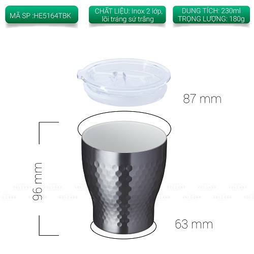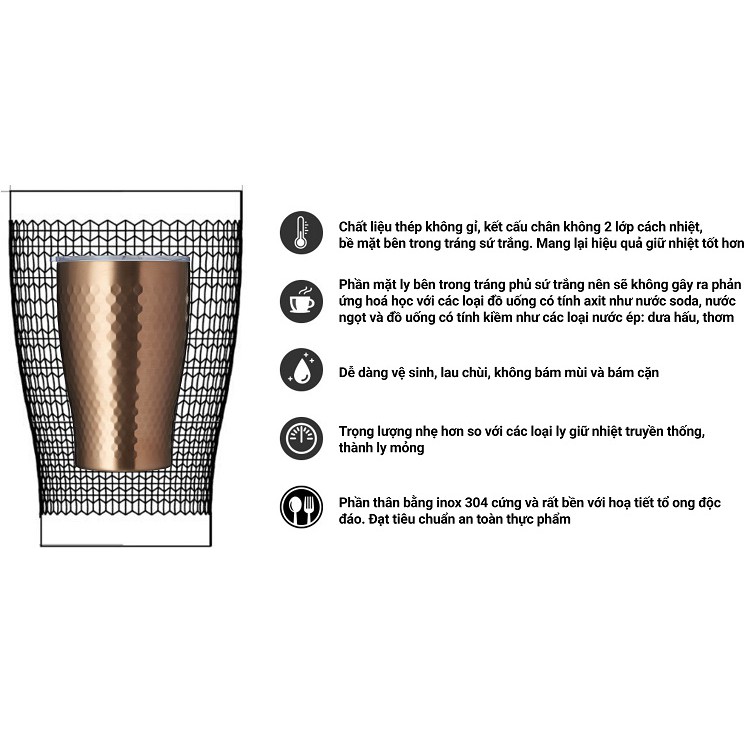 Volcano Ly giữ nhiệt inox hoa văn tổ ong 2 lớp phủ sứ Tiamo 230ml
