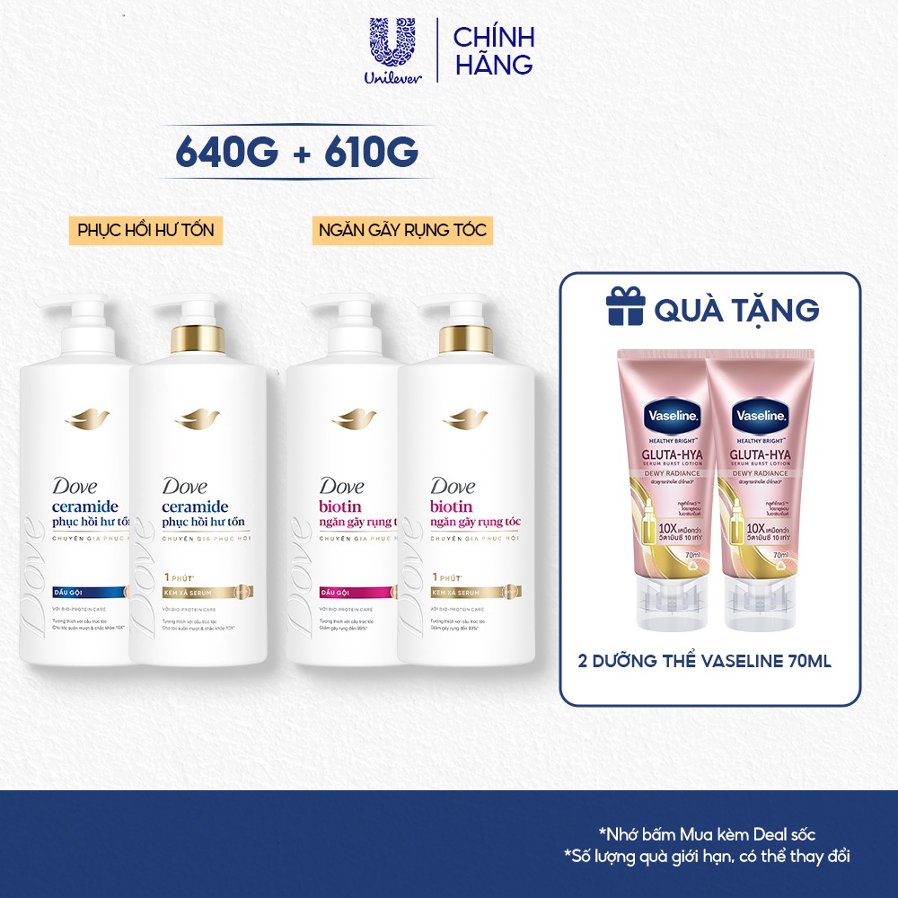[LIVE HANNAH] Combo Dầu Gội, Kem Xả Dove Ceramide Phục hồi hư tổn / Biotin Ngăn gãy rụng tóc 640g, 610g