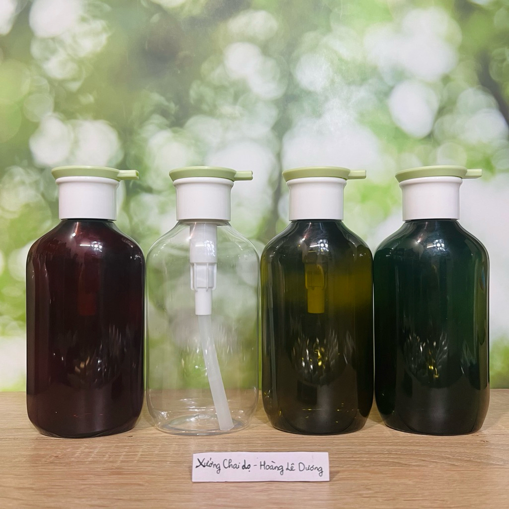 Chai nhựa PET 300ml Dẹp Màu Nâu,Xanh,Trong,Lá Mạ.Đựng kem body,dầu gội,sữa tắm,chiết đựng mỹ phẩm có kèm vòi bơm,vòi xịt