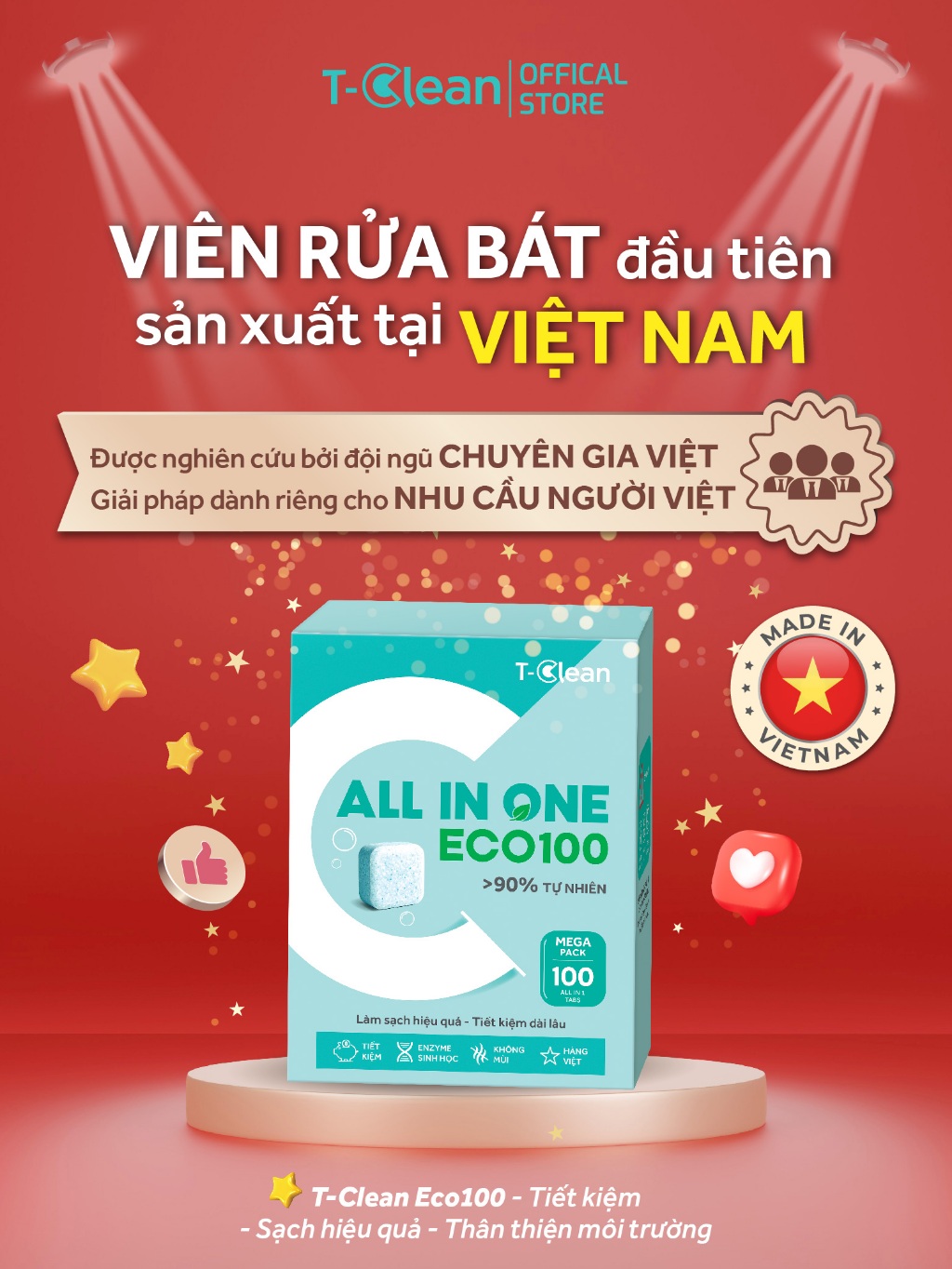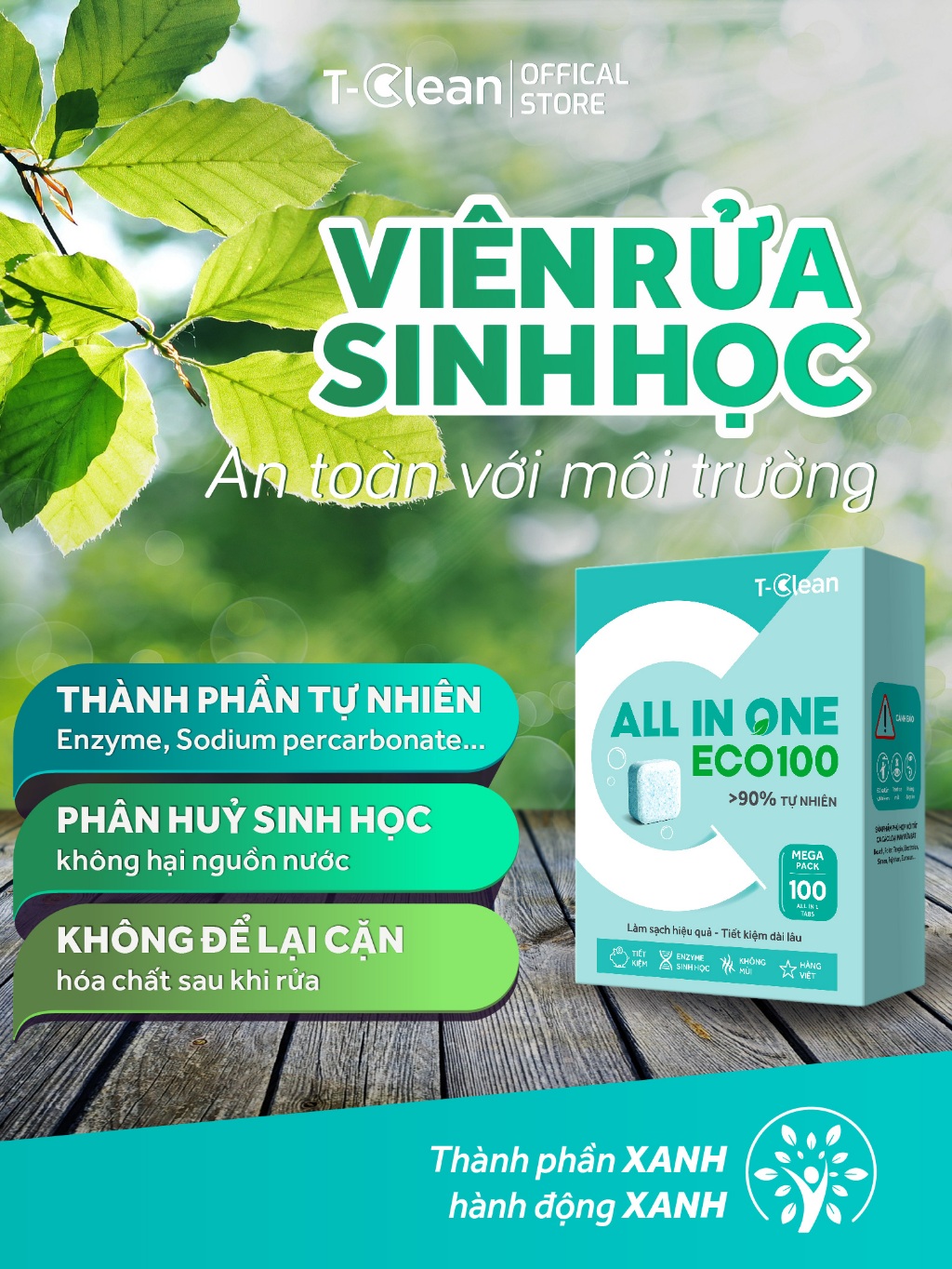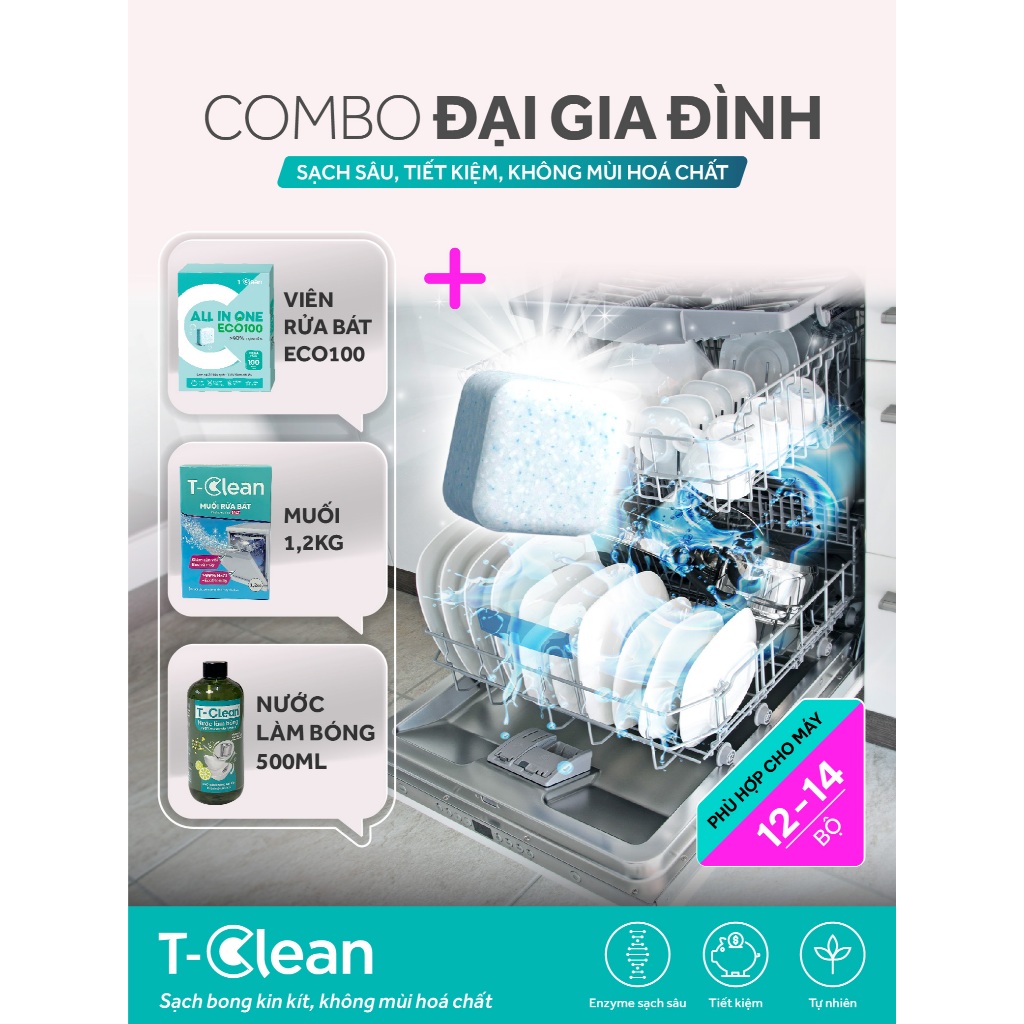 T-Clean Viên Rửa Bát All in one Eco100 – Hộp 100V ,Sạch Dầu Mỡ,Không Mùi, Tiết Kiệm Cho Máy 12–14 Bộ