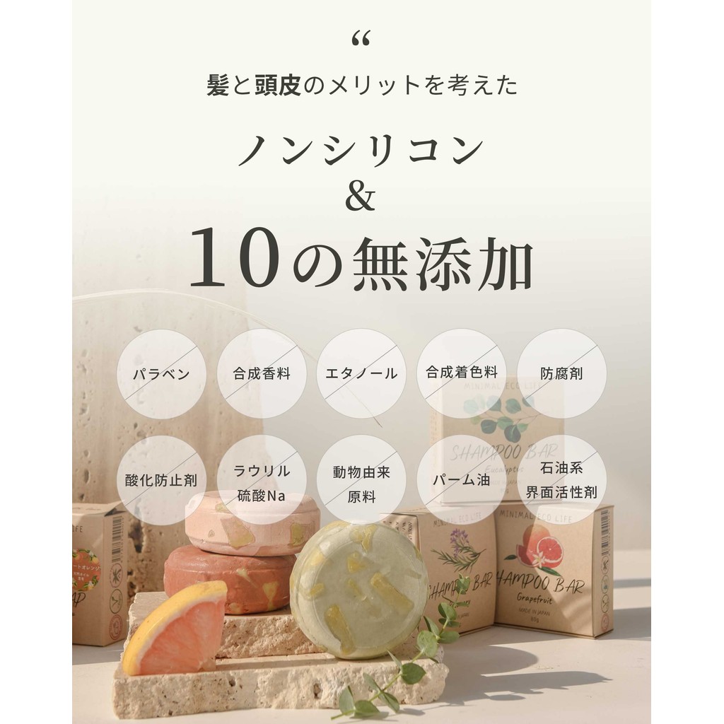Japanese Handmade Solid Shampoo Bar - MEL, Natural Ingredients, Silicone-Free, Moisturizing, 80g, Eco-Friendly Minimalist Soap (Rosemary, Grapefruit, Eucalyptus)