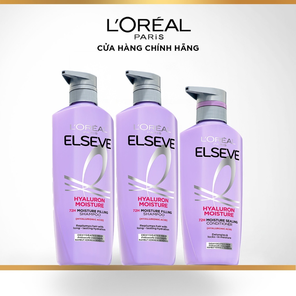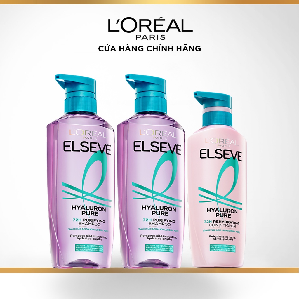 Bộ đôi gội & 1 dầu xả nhẹ bồng tóc 72H Elseve HA Moist da đầu khô hoặc Pure da đầu dầu L'Oreal Paris 620mlx2, 375ml