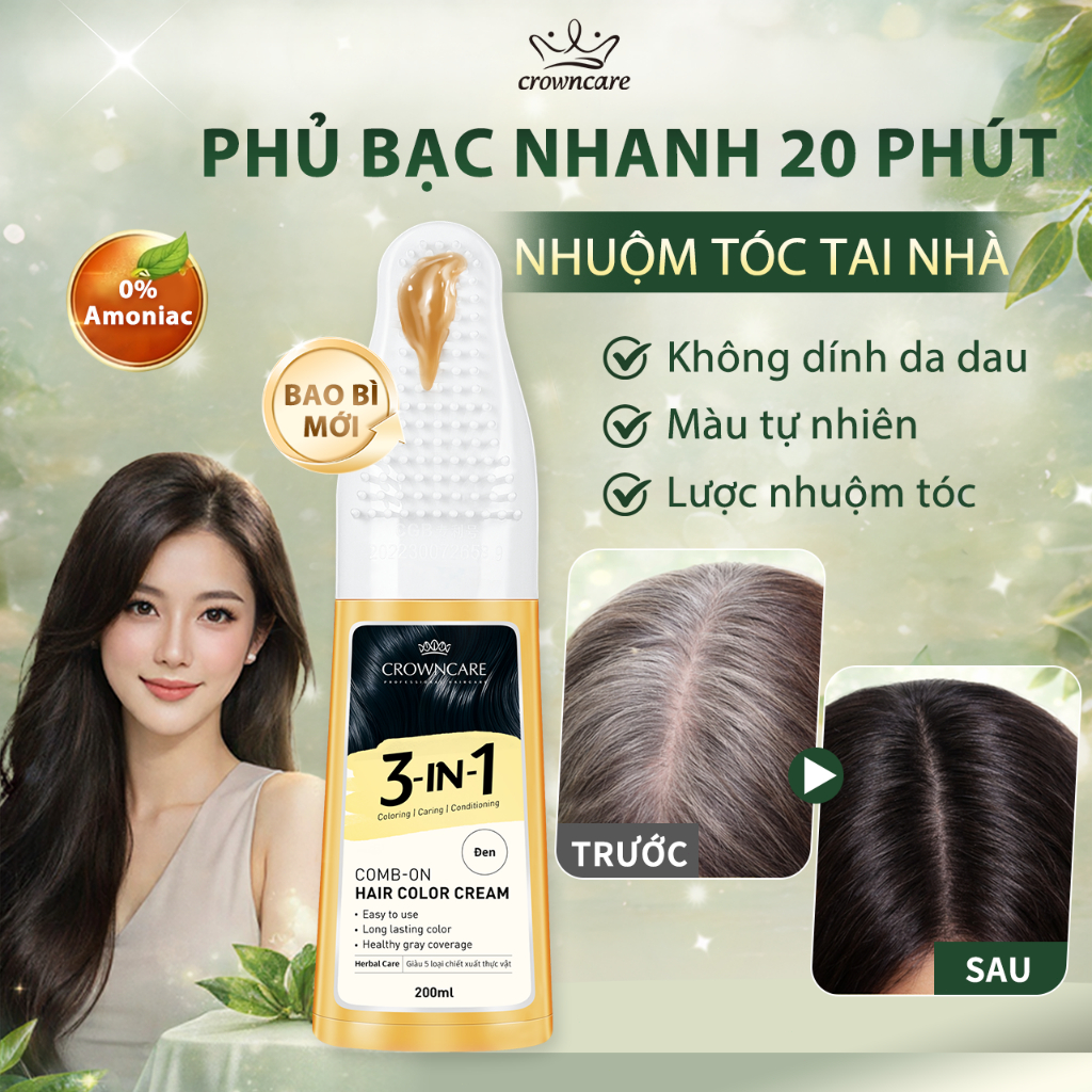 Crowncare Dầu Gội Nhuộm Tóc, Phủ Bạc 20 Phút Tại Nhà, Kèm Lược Nhuộm Thảo Dược, Màu Đen/Nâu Tự Nhiên Chuẩn Salon, 200ml
