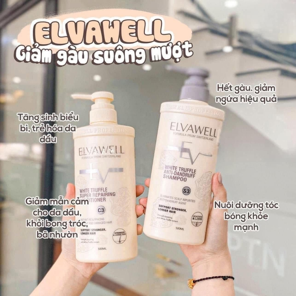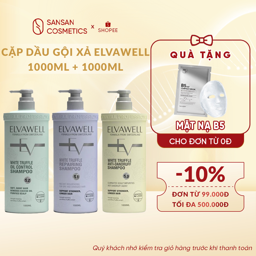 Cặp Dầu Gội Xả Elvawell 1000ml + 1000ml – Giảm Rụng, Trị Gàu, Phục Hồi Tóc Hư – 3 Màu Xanh/Trắng/Tím – SANSAN