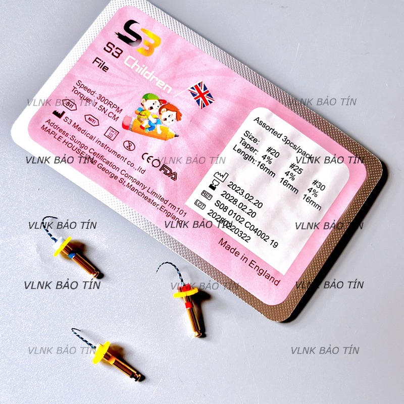 File máy nội nha trẻ em 16mm–Độ thuôn 4% | Size 20/25/30 | Vỉ 3 cây | Dụng cụ điều trị tủy răng sữa