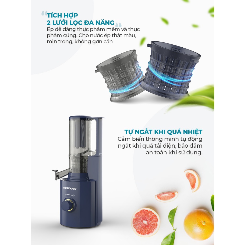 Máy ép chậm Sunhouse SHD5512 Công suất lớn 250W, ép kiệt bã mọi loại hoa quả, rau củ
